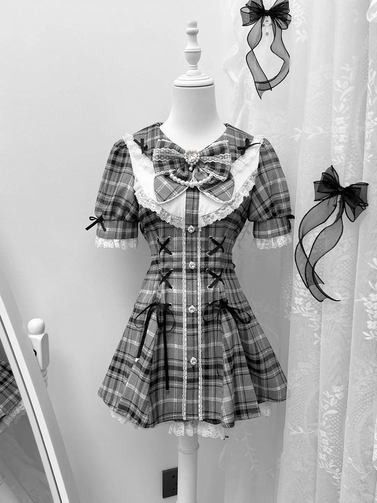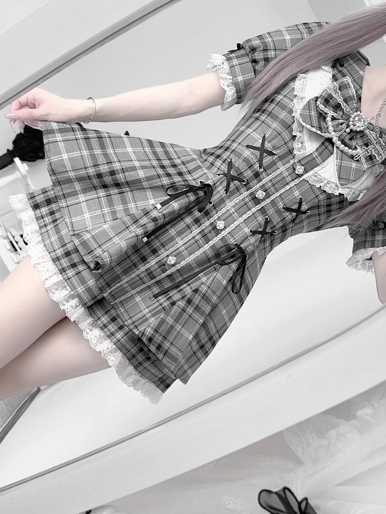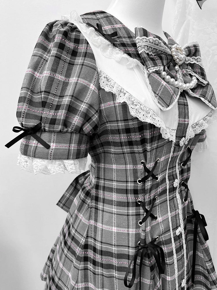 グレーケイチェックウエストラインストーンジライミニドレス+ショーツ装飾セットレースアップディテール