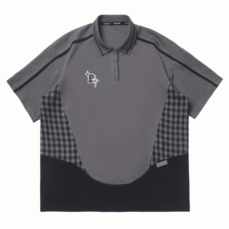 グレーのチェック柄パッチワークデザインポロカラーのゆったりカジュアルTシャツ