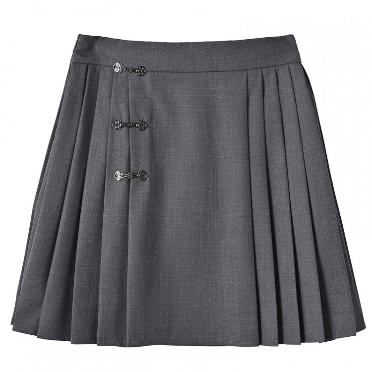 グレーのプレッピーノットボタン太もも丈プリーツスカート