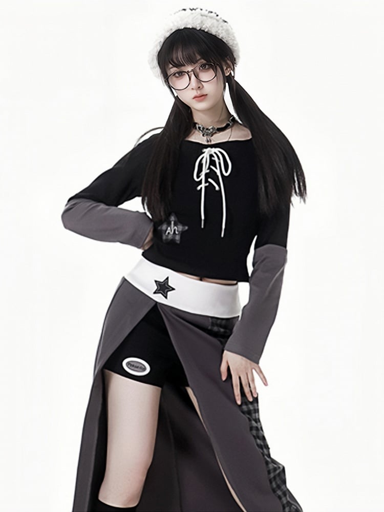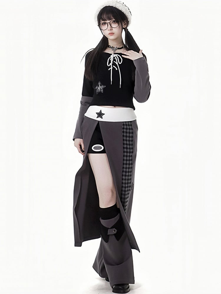 グレーパープルのスターアップリケ付き太もも丈スリット入りチェック柄ロングスカート