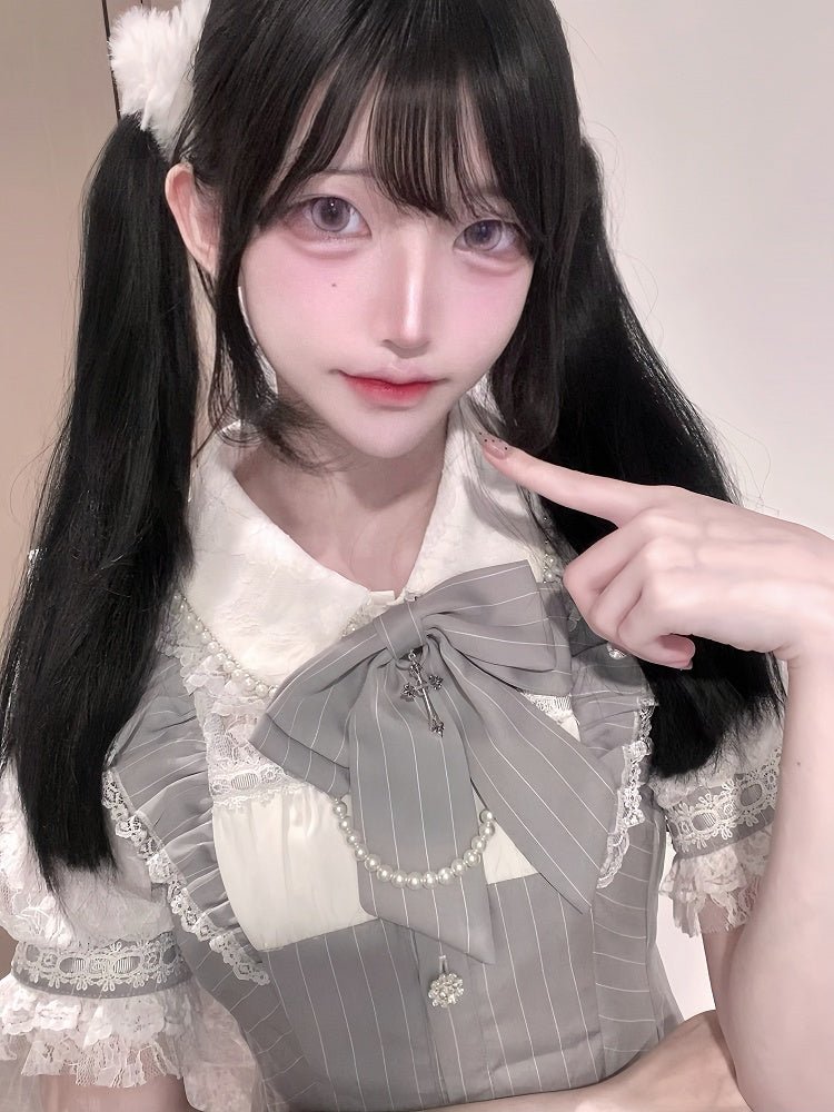 青と白のオールドスクールロリータファッションドレス 蝶結びディテール JSK セット