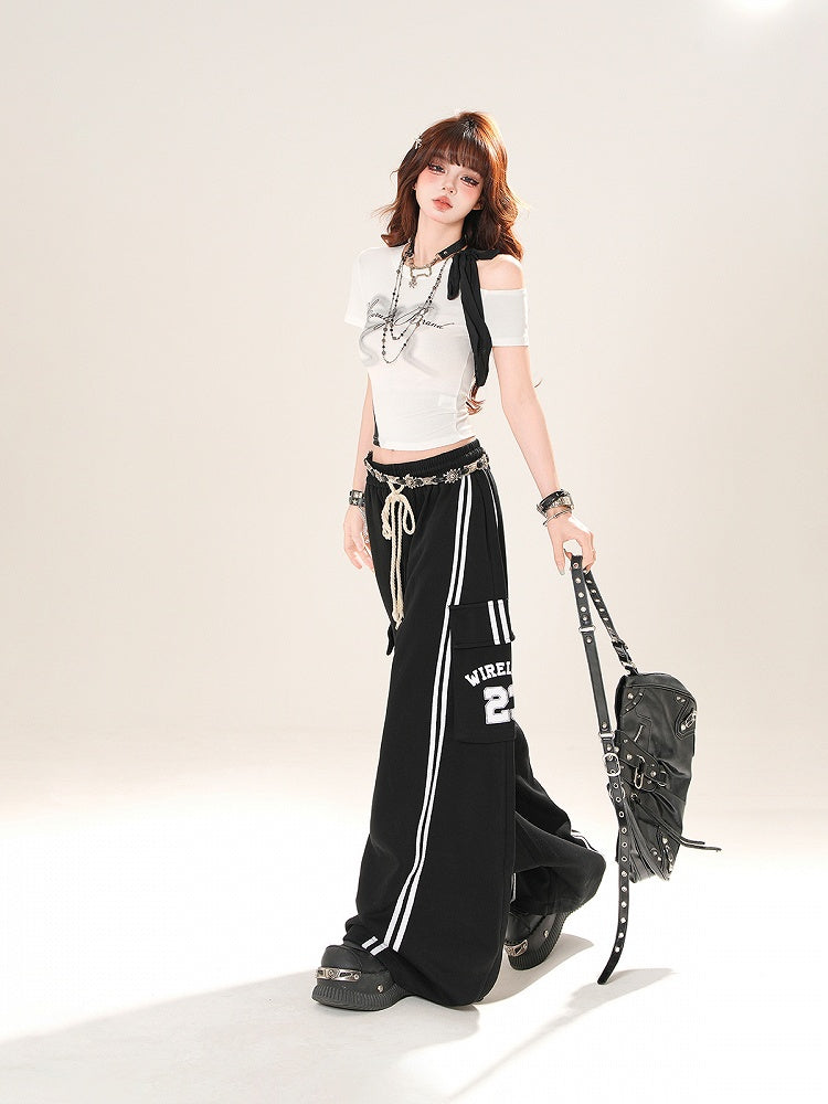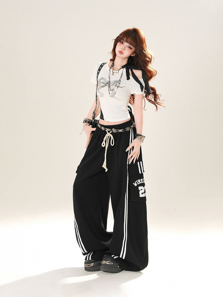 グレー/ホワイト カットアウトショルダー ボウプリントTシャツ