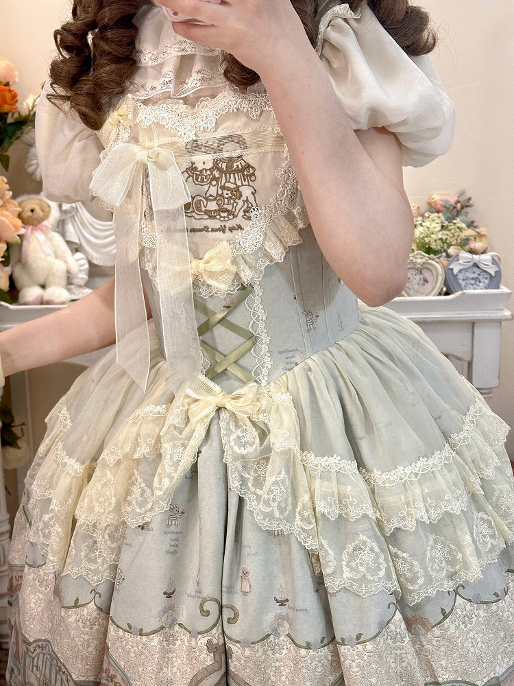 グリーン/ベージュのボーンウエストテディスイートロリータジャンパースカート