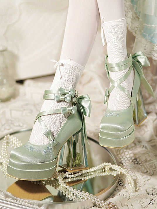 グリーンのカメリアフラワーハイブロックヒールエレガントなプラットフォームハイヒール