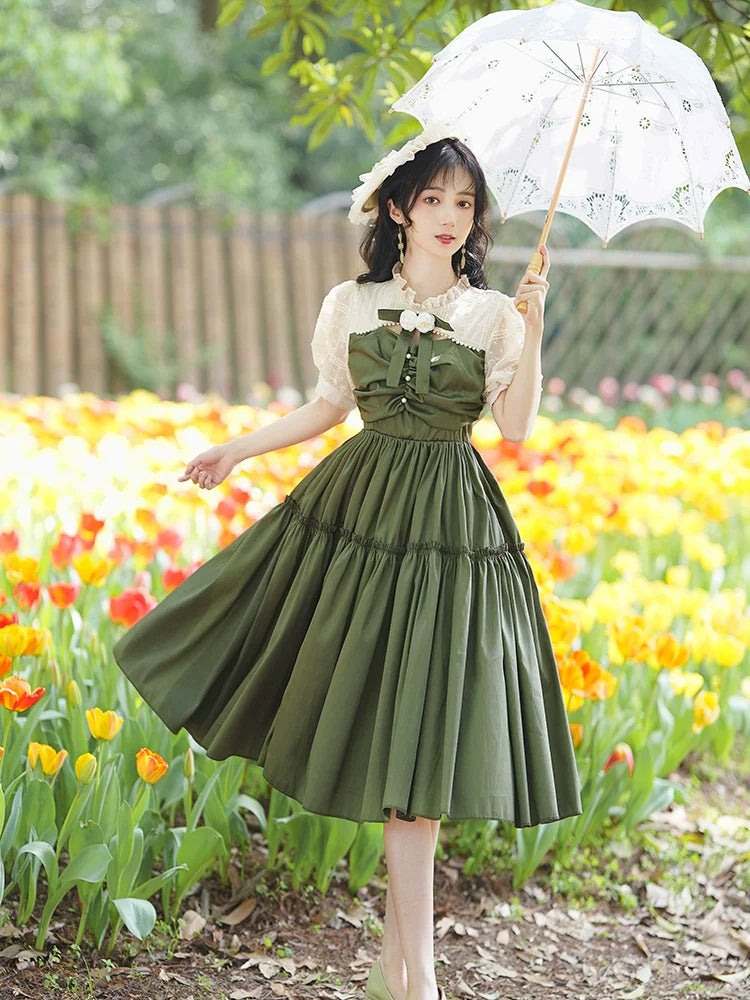 青と白のオールドスクールロリータファッションドレス 蝶結びディテール JSK セット