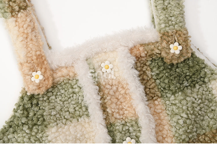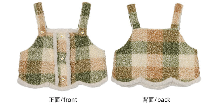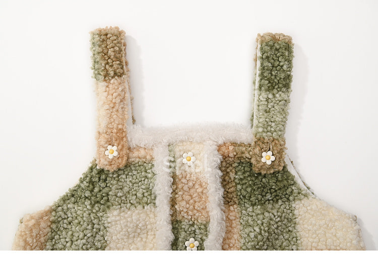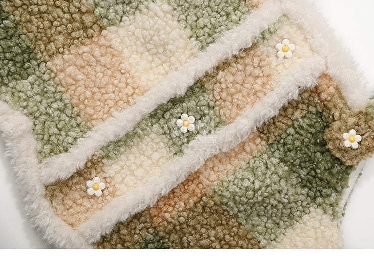 グリーンフローラルボタンディテールチェック柄フリースベスト