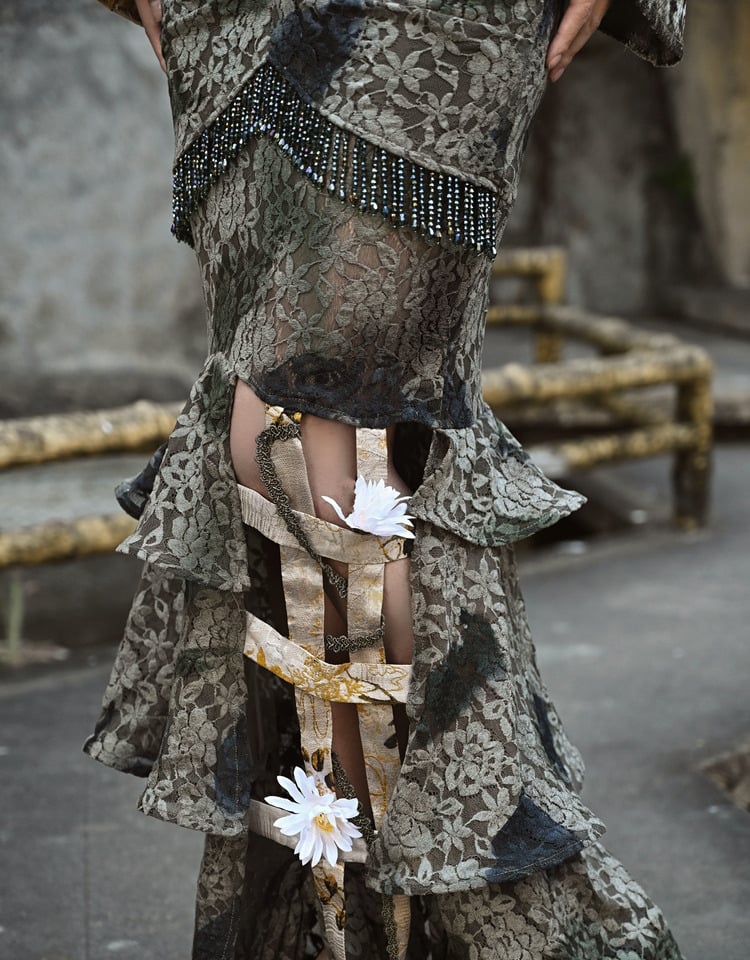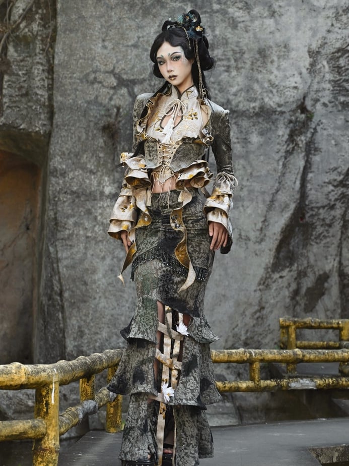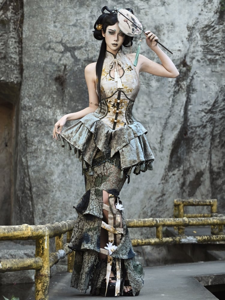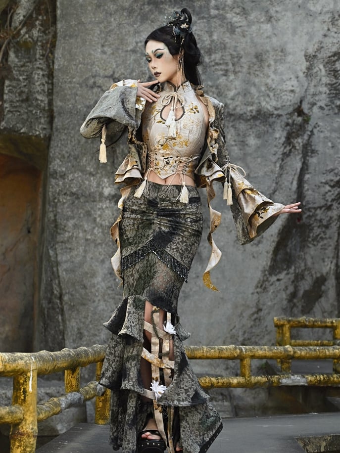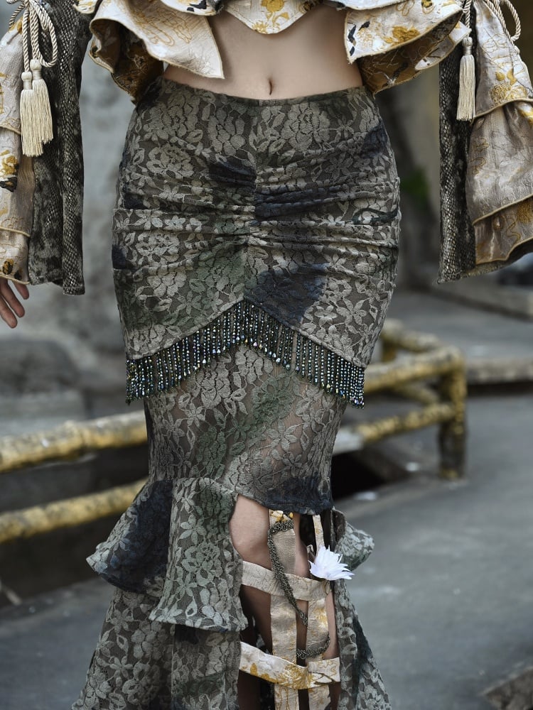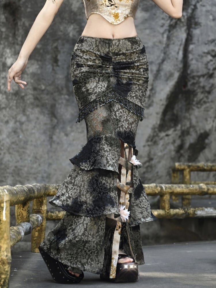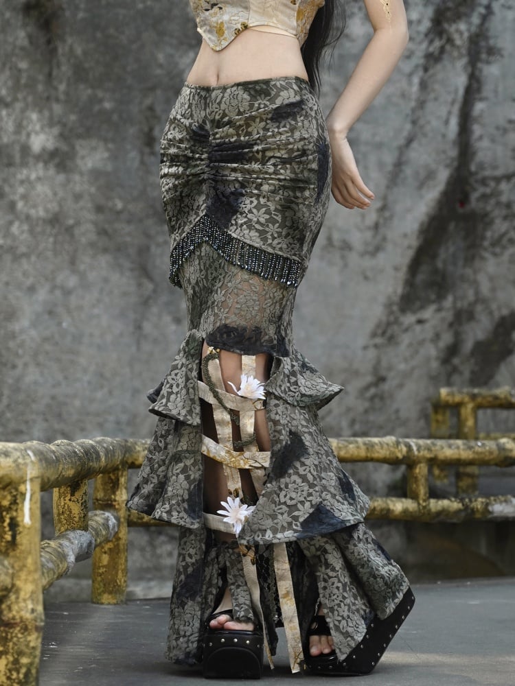 グリーンタイフラワーバードケージヘムラインマーメイドスカート