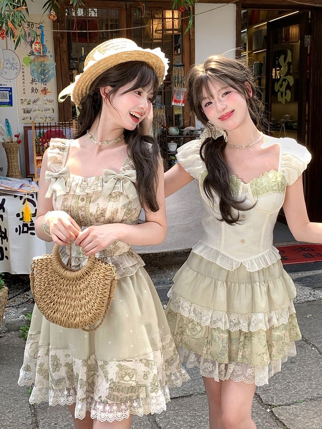取り外し可能な蝶結び付きグリーンヴィンテージグレーププリントノースリーブトップスライト