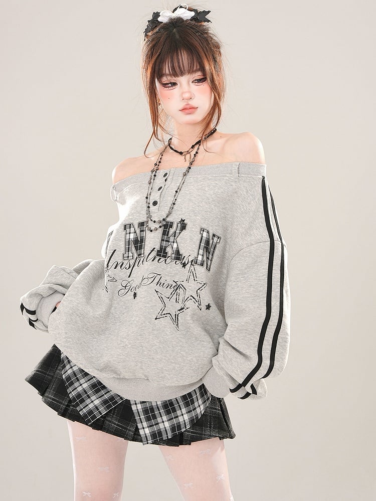 グレーレターパッチ刺繍オフショルダーネックラインスウェットシャツ