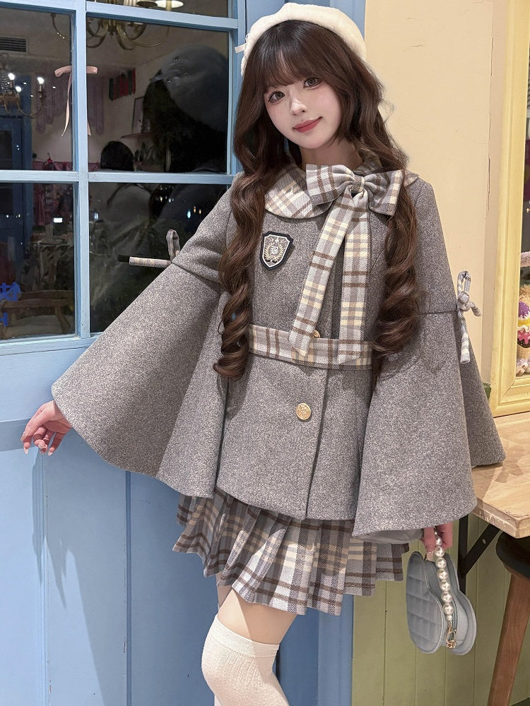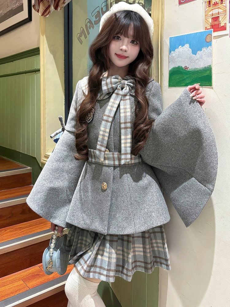 グレーのプレッピースタイルベルスリーブジャケット(チェック柄リボンアクセント付き)+グレーのチェック柄プリーツスカートセット