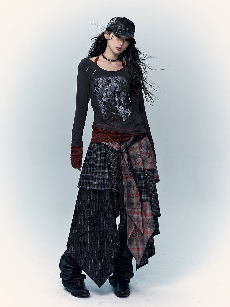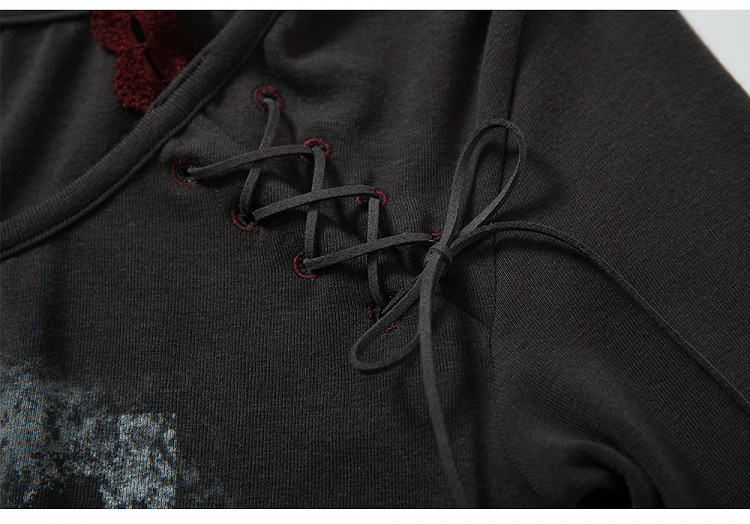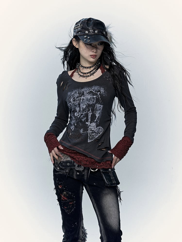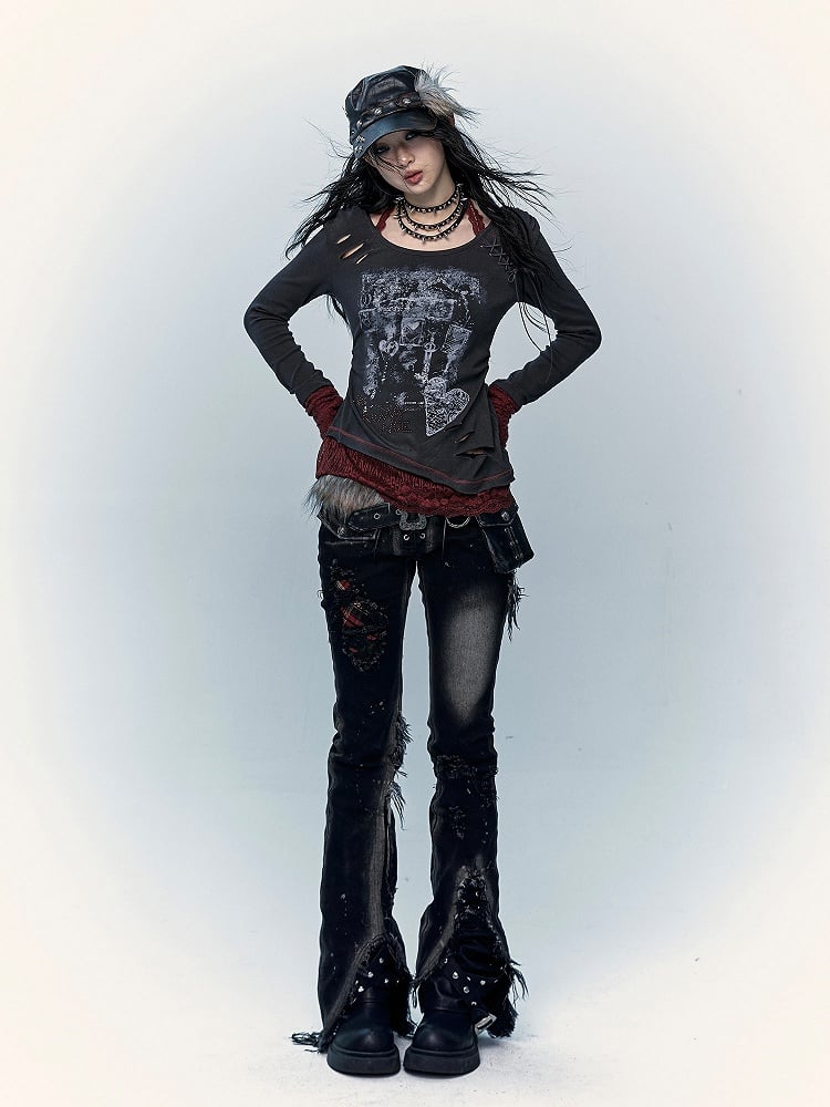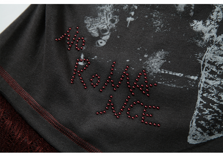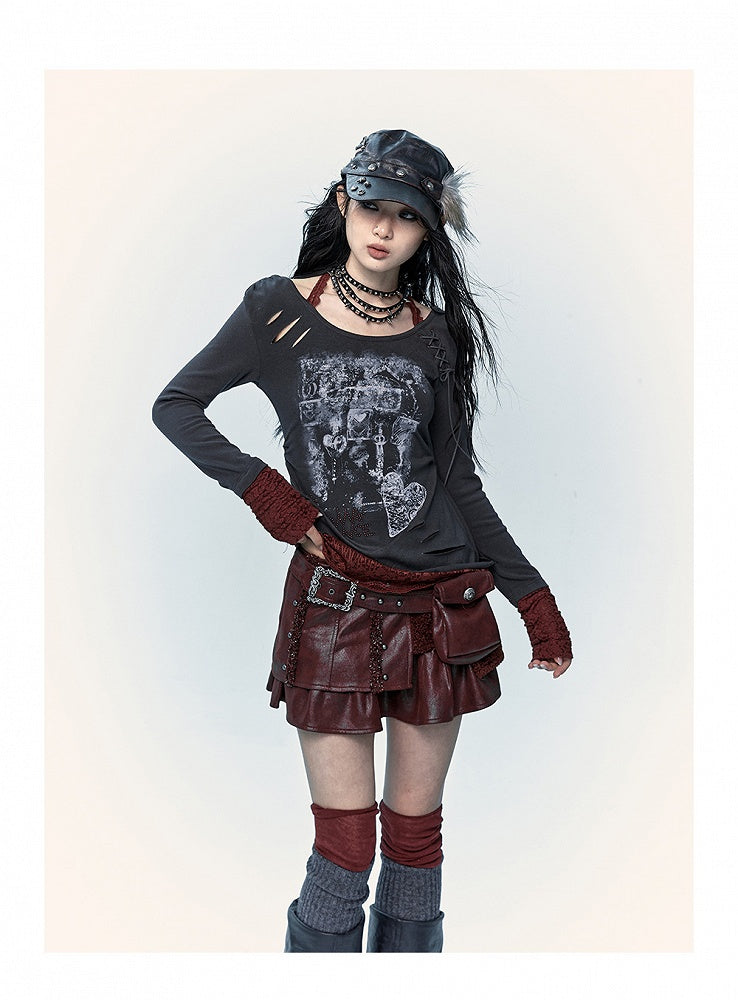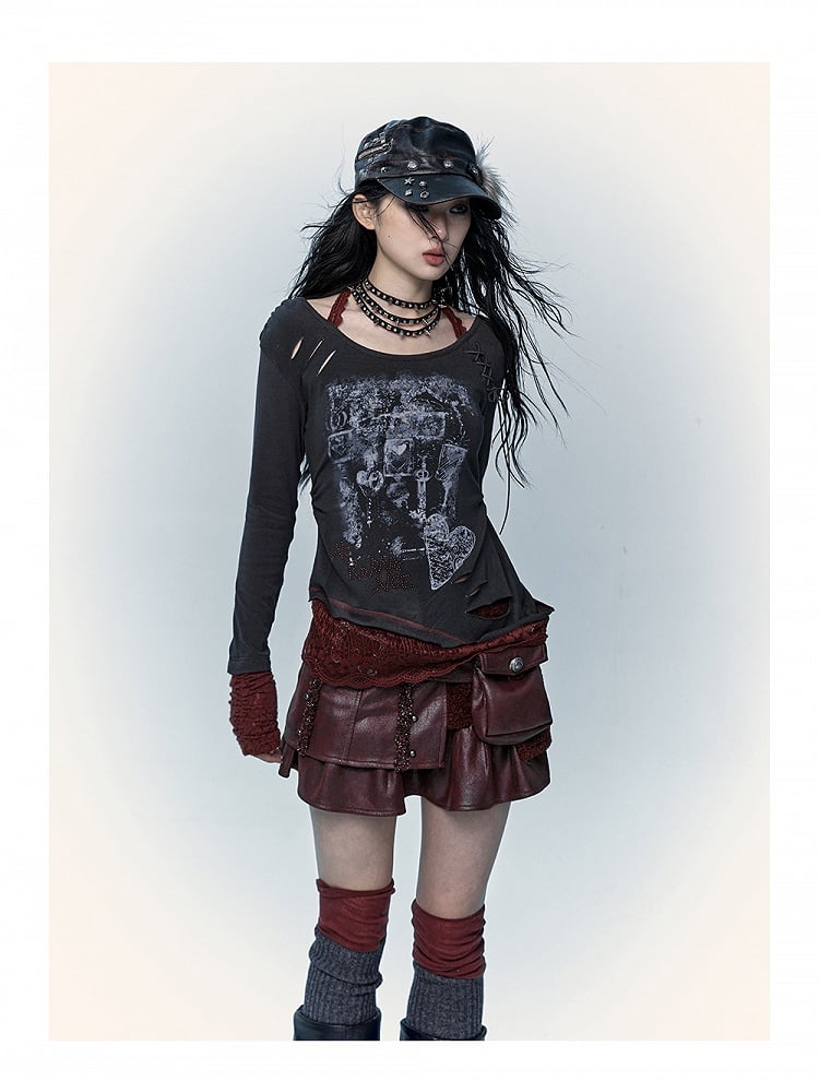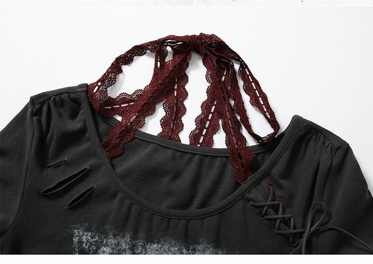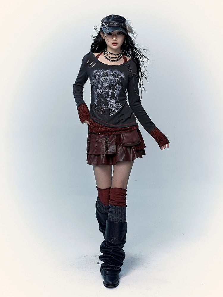 レースアップとダメージ加工の穴があいたグレー&レッドのホルターネックトップス