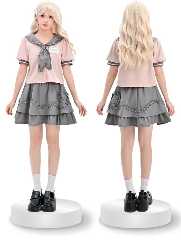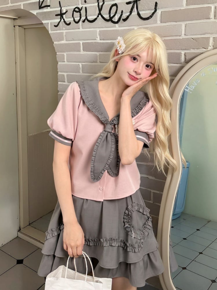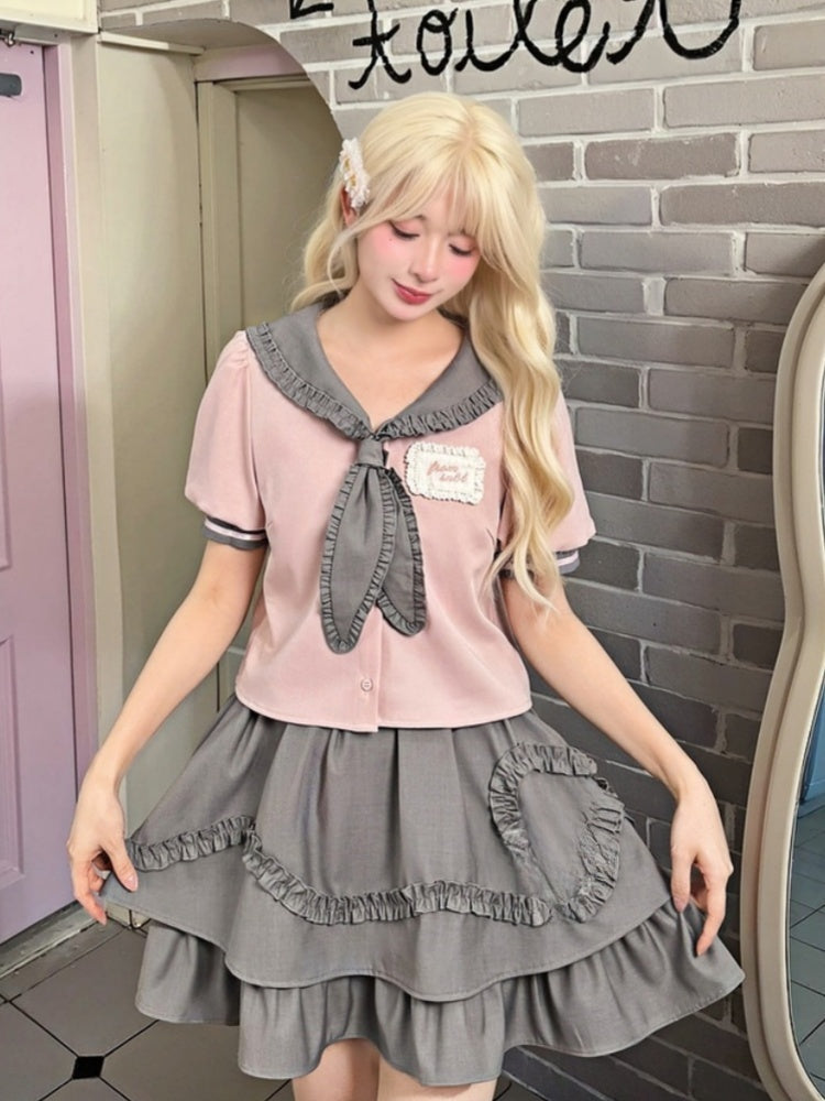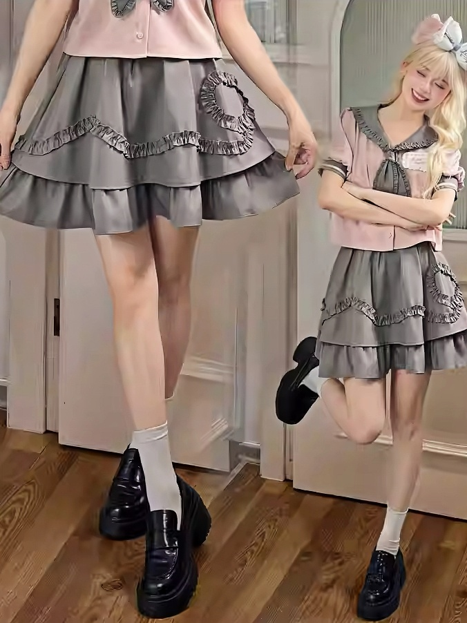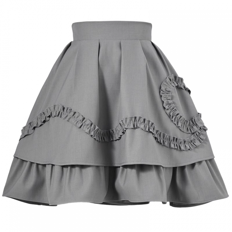 グレーのプレッピースタイルのフリルボウ付きダブルレイヤーAラインスカート