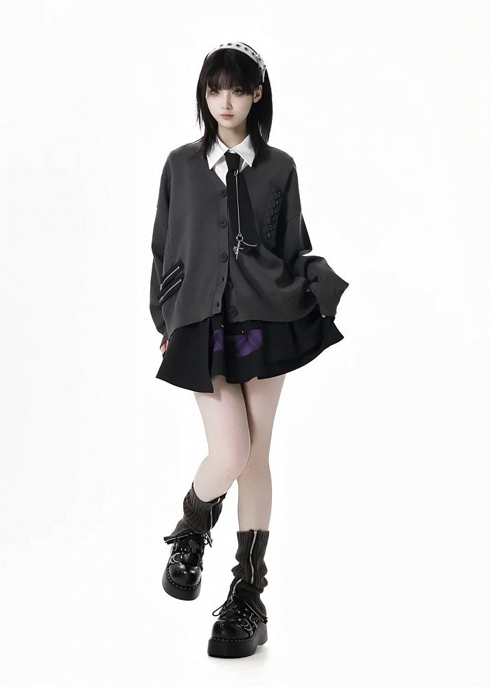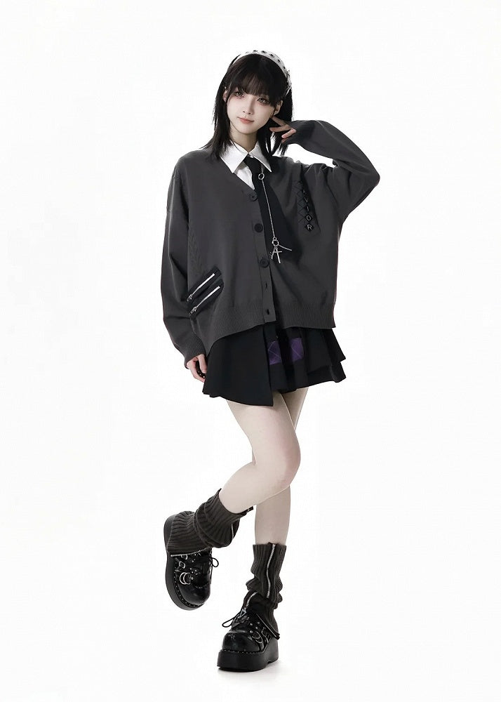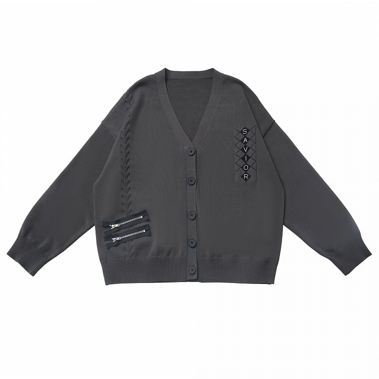 グレーのVネック、ジッパーディテール、春ニットカーディガン