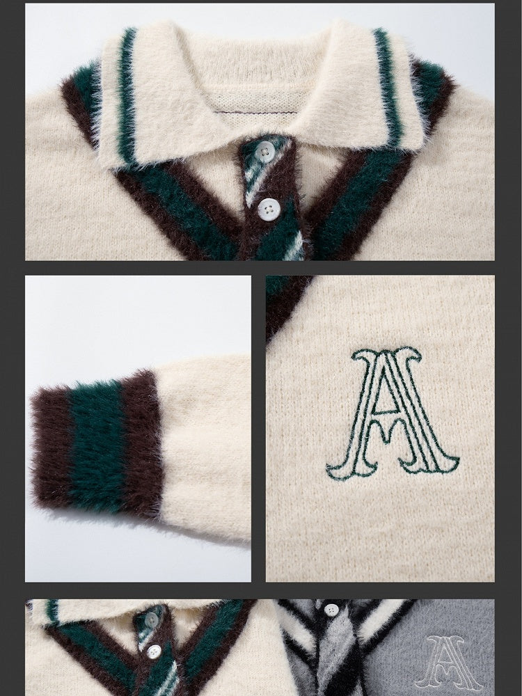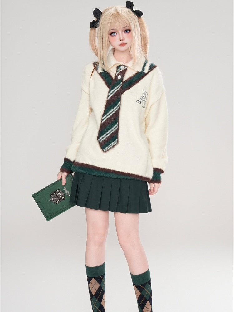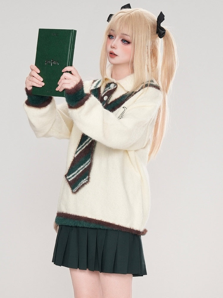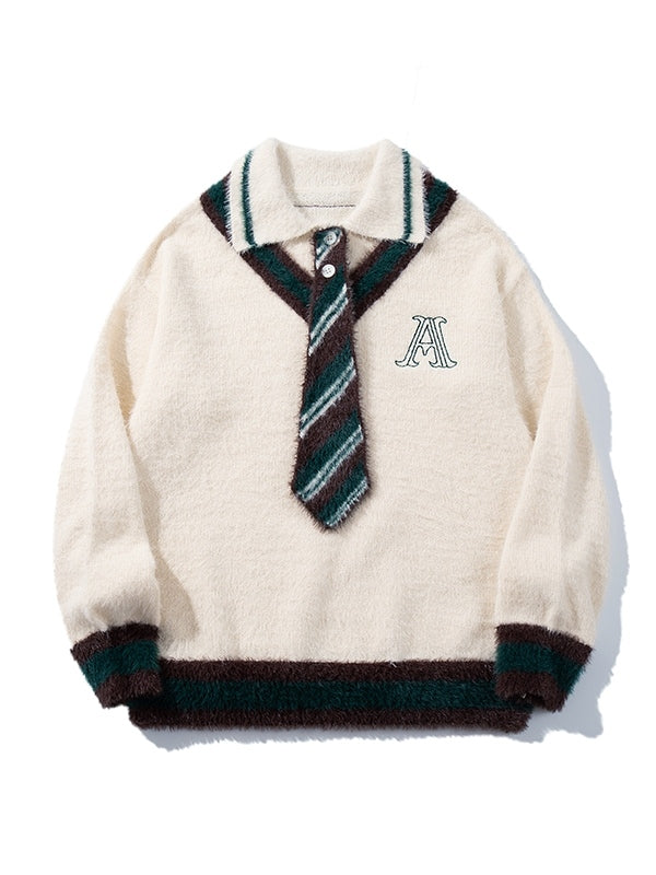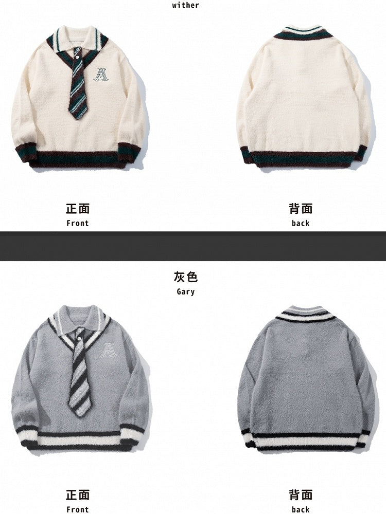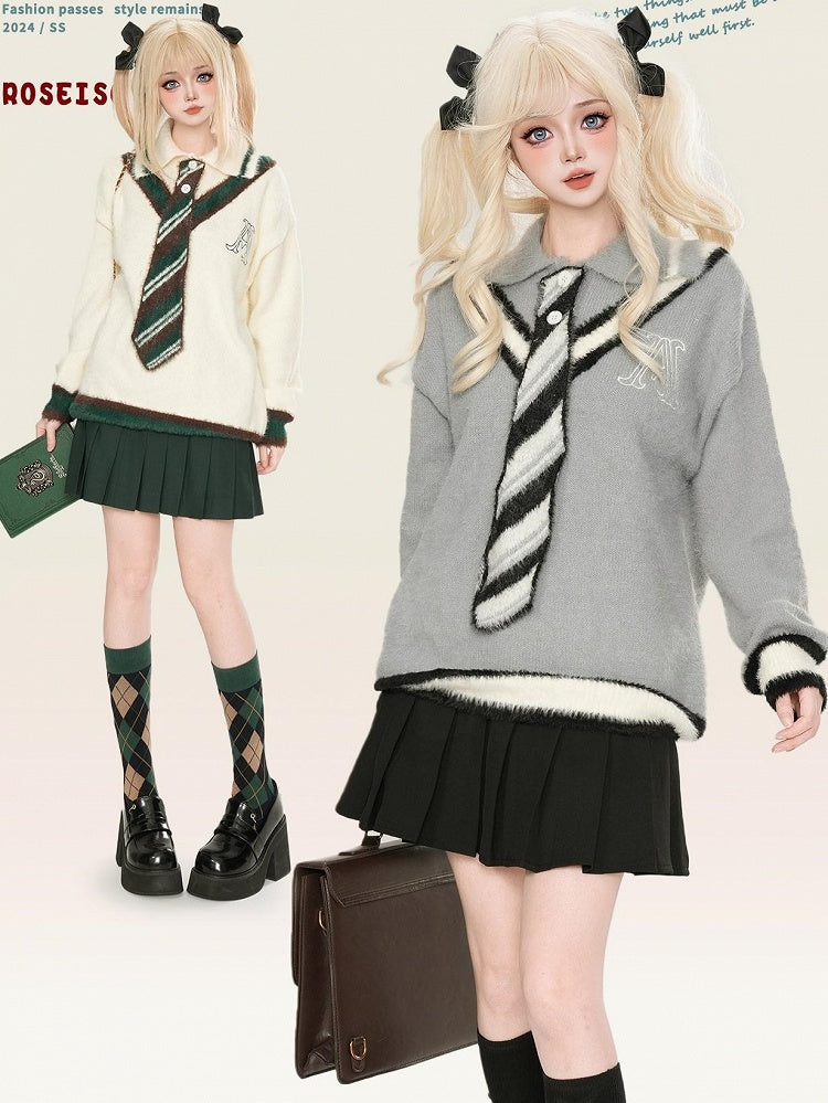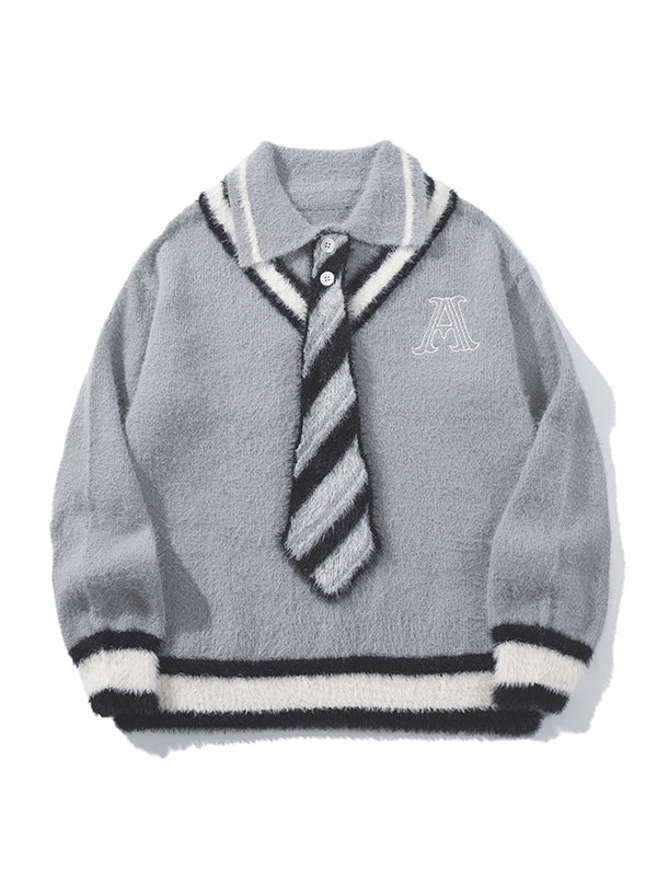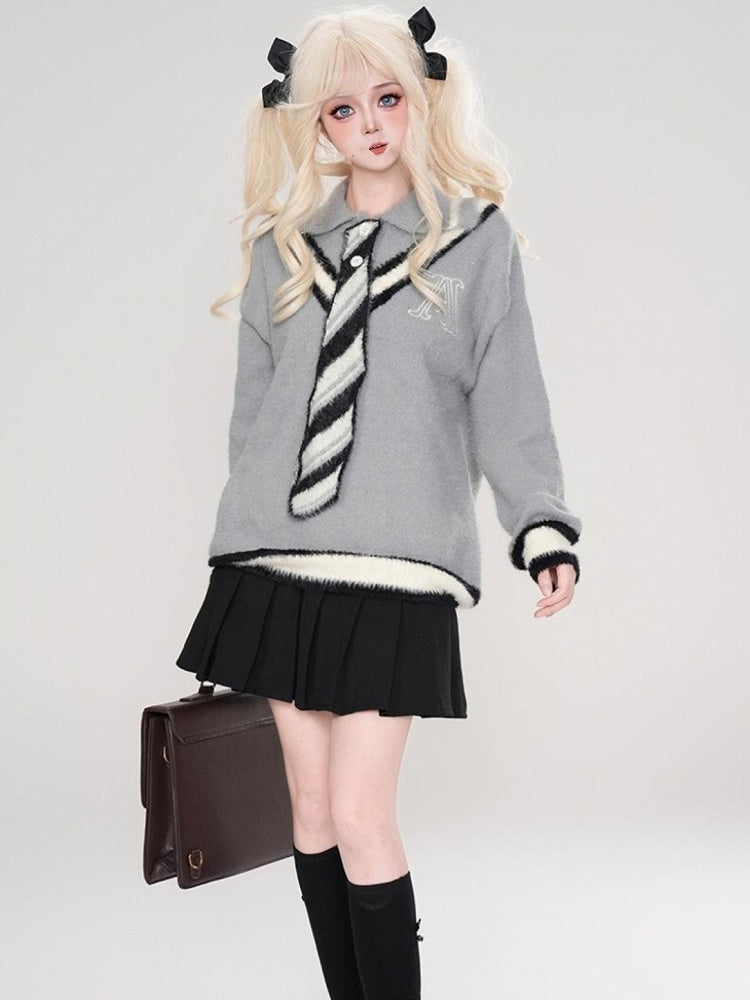 グレー/ホワイトのポロカラー プレッピースタイル セーター(ニットタイ付き)