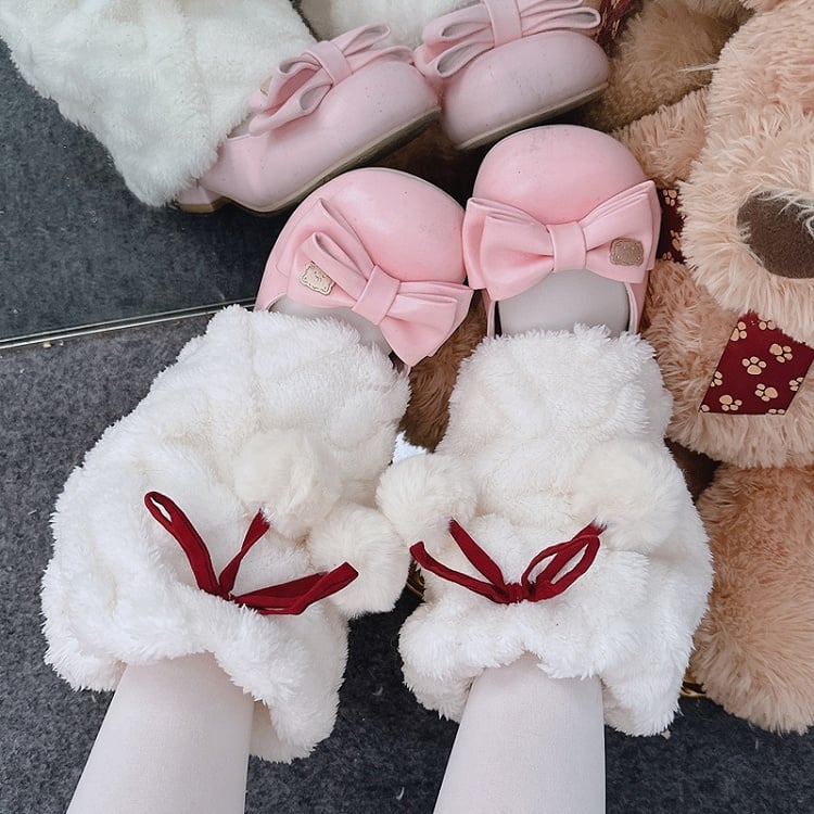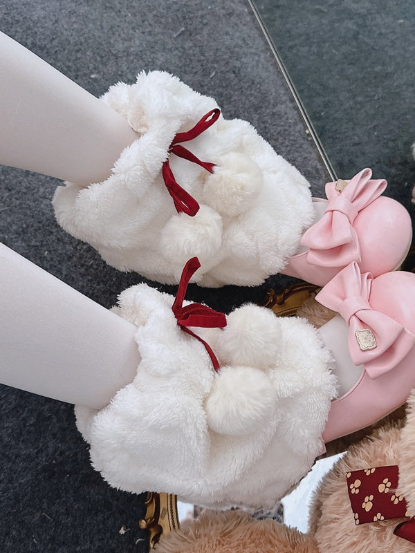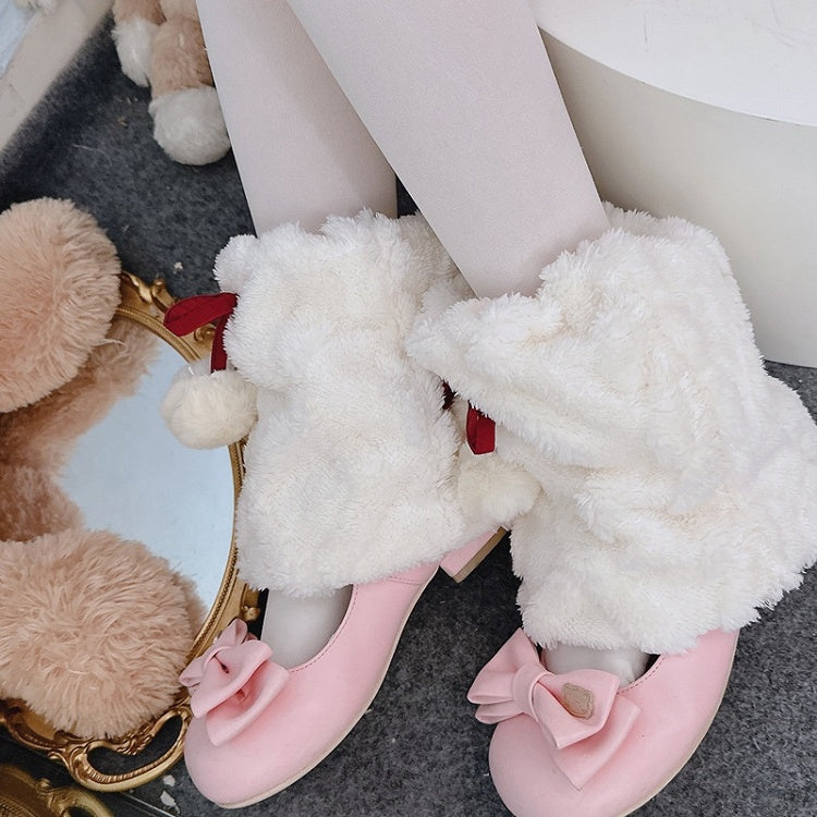 グレーのY2Kリボン付きプラッシュレッグウォーマー(ポンポン付き)