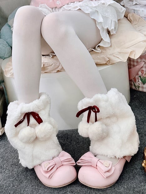 グレーのY2Kリボンプラッシュレッグウォーマーで、暖かくキュートな装いを!柔らかなプラッシュ素材の裏地と可愛らしいポンポンが特徴のこのウォーマーは、足を暖かく包み込みながら、コーディネートに遊び心をプラス。肌寒い冬の日にぴったりです。