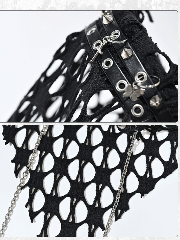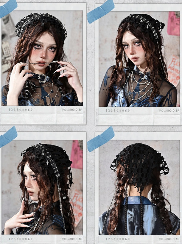 グランジ パンクロック ブラック スタッズ メッシュ トライアングル スカーフ KC クロスチャーム チェーンディテール