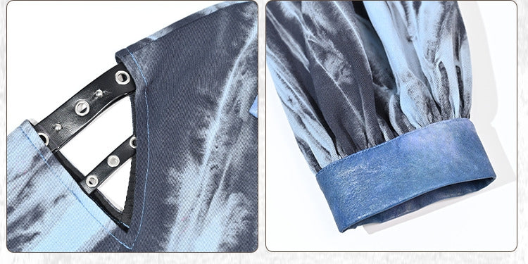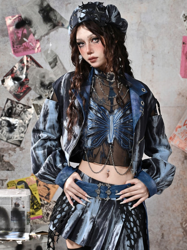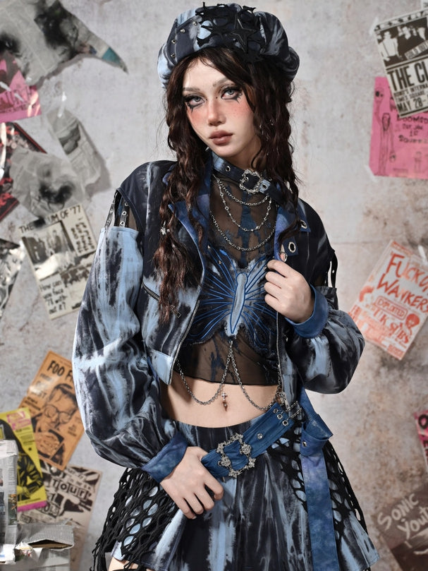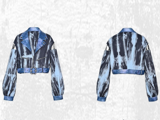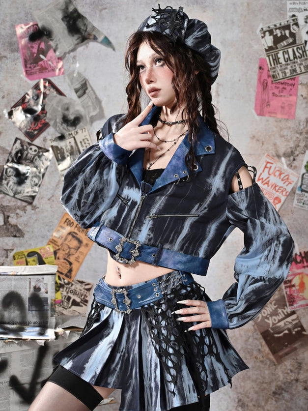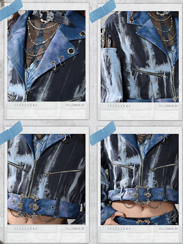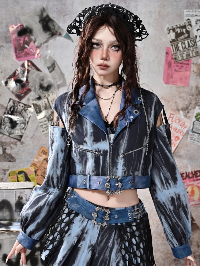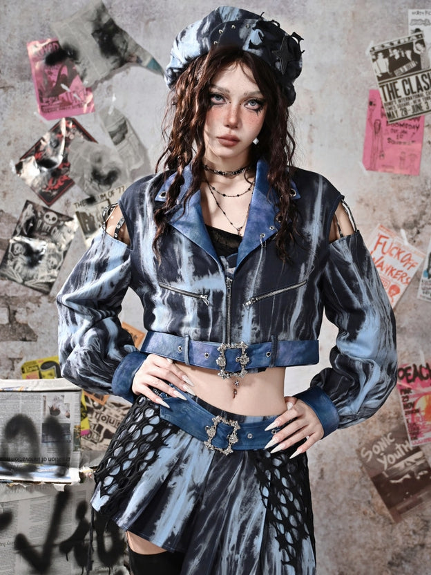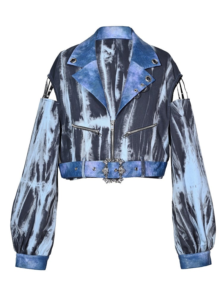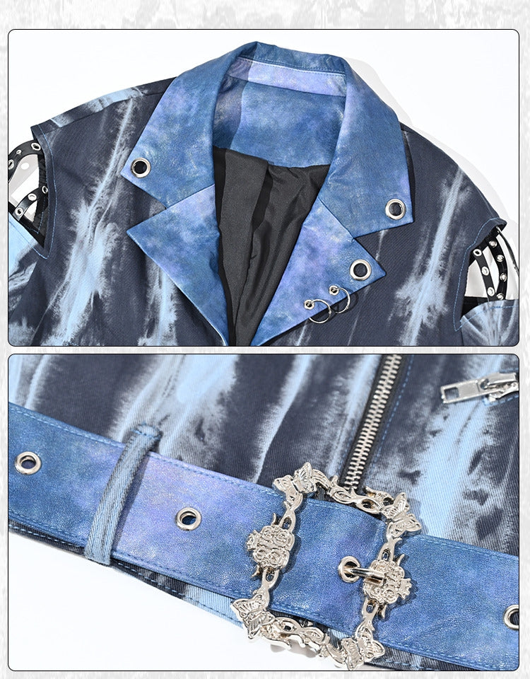 グランジパンクロックブルーカットアウトスリーブタイダイPUモトジャケット(フリーベルト付き)