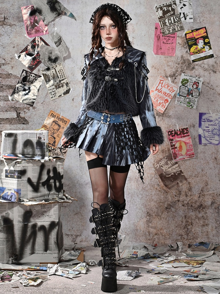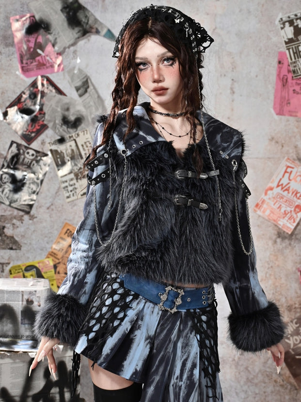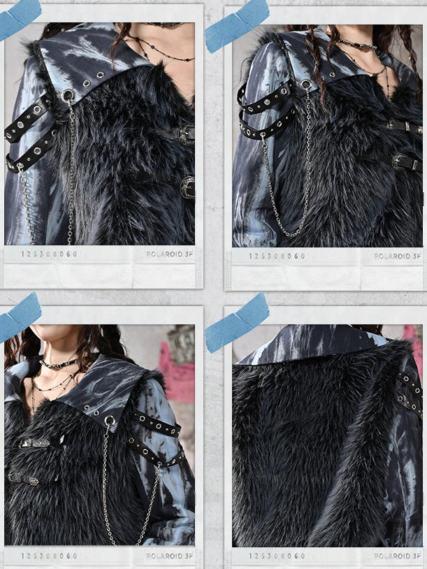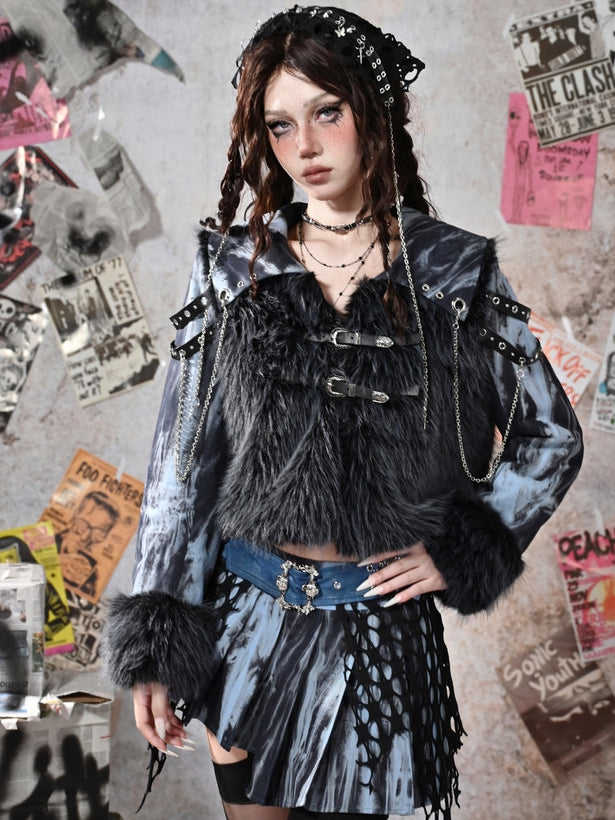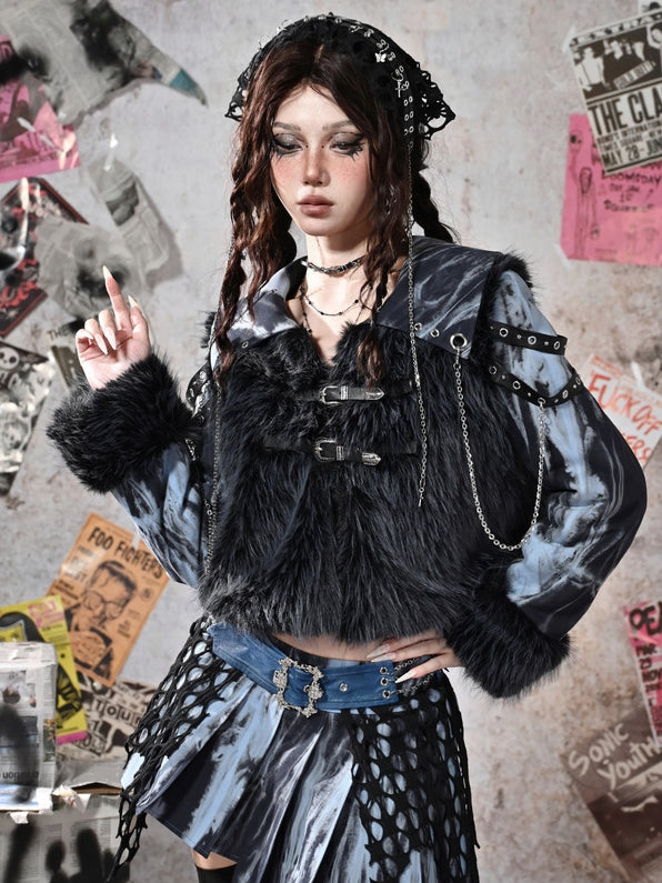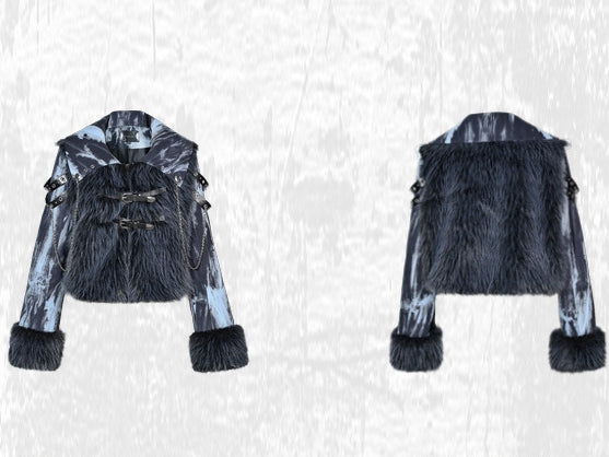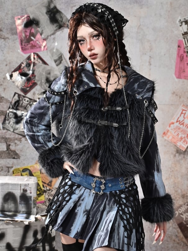 グランジパンクロックブルーフェイクファーパッチワークジャケットチェーンディテール