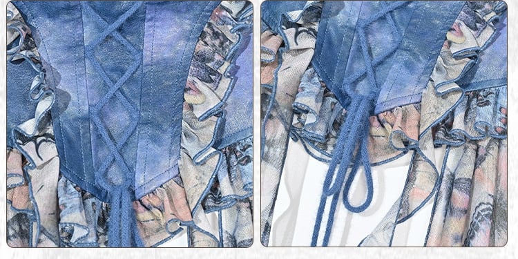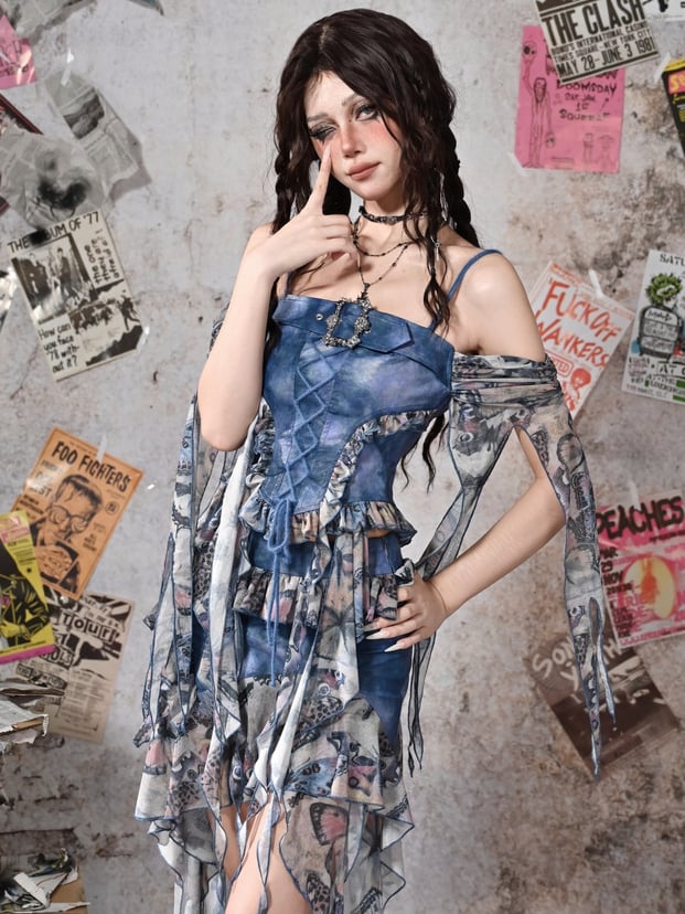 グランジ、パンク、フェアリーコアのスタイルを融合させた、愛らしいトップス。メッシュのパッチワークデザインにブルーの蝶々、そしてフリルの裾が特徴で、ワードローブに遊び心のあるアクセントを添えるのにぴったりです。このマストハブアイテムで、個性をアピールしましょう。