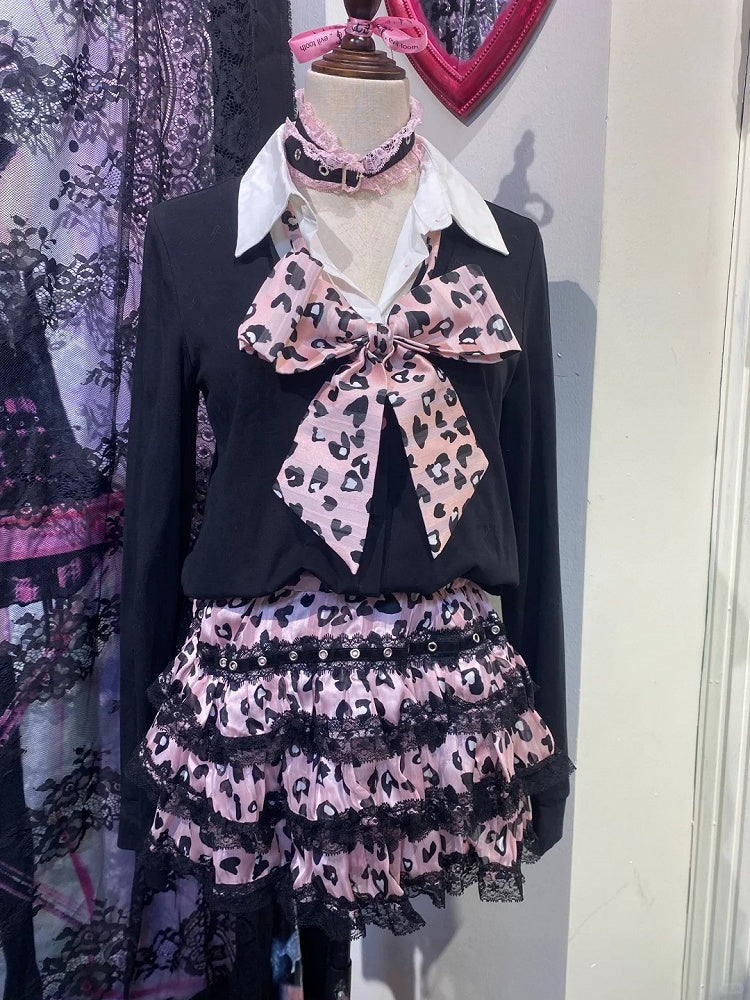 ギャルファッション ピンク ヒョウ柄 レーストリム Y2K ティアードスカート(蝶ネクタイ付き)