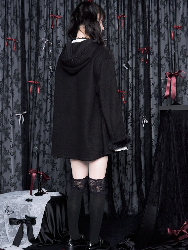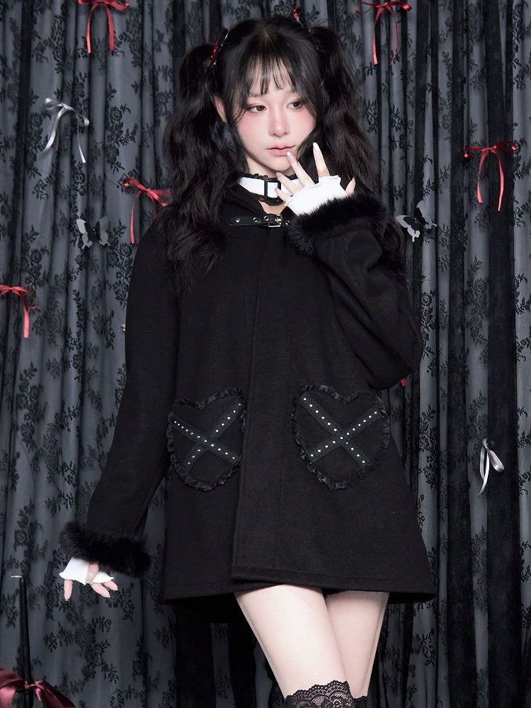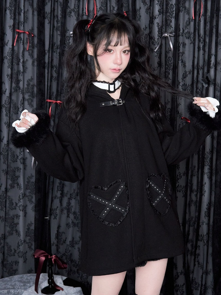 ジライケイ プラッシュ袖口 ハートアップリケポケット バックルストラップ スタッズ付き ブラックフード付きジャケット
