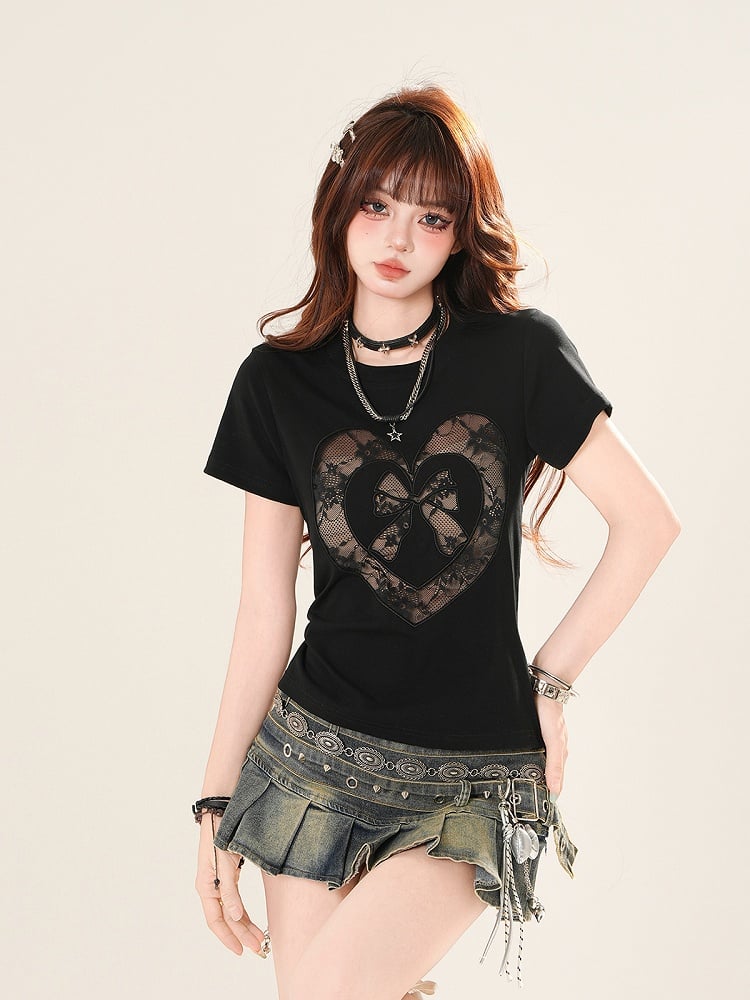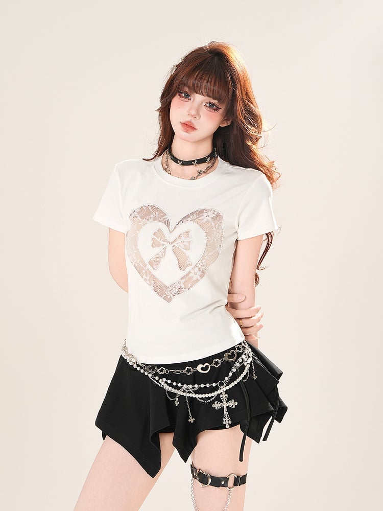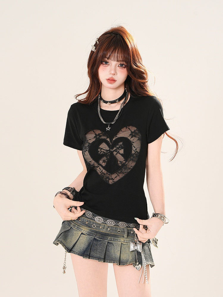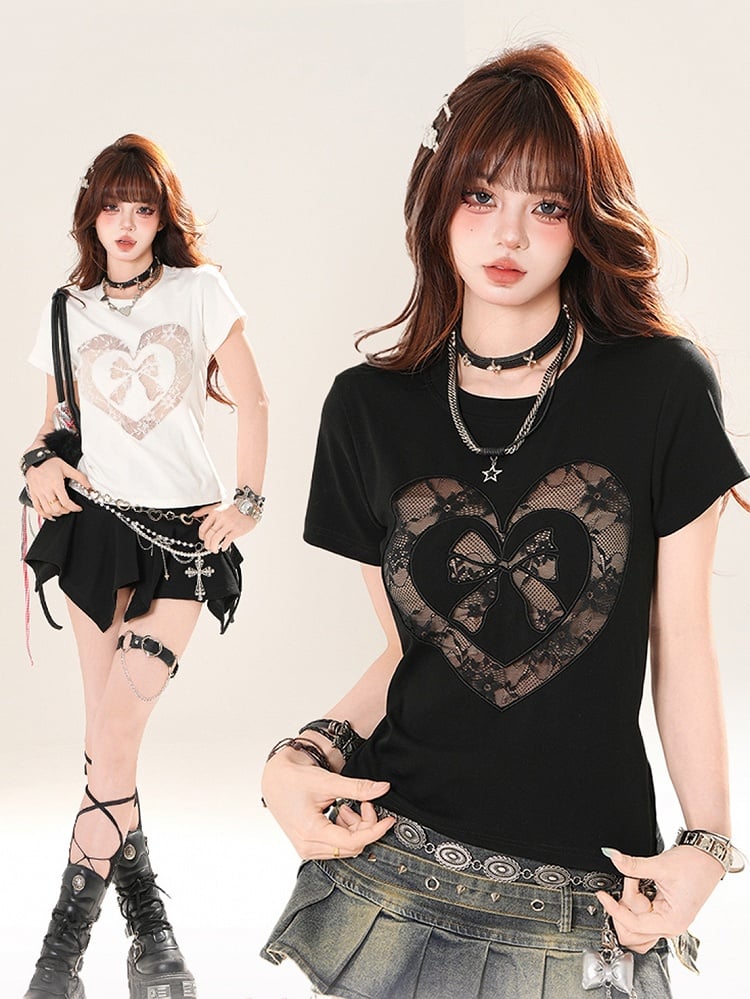 ブラック/ホワイト ハートカットアウト レースパッチ ラウンドネック Tシャツ