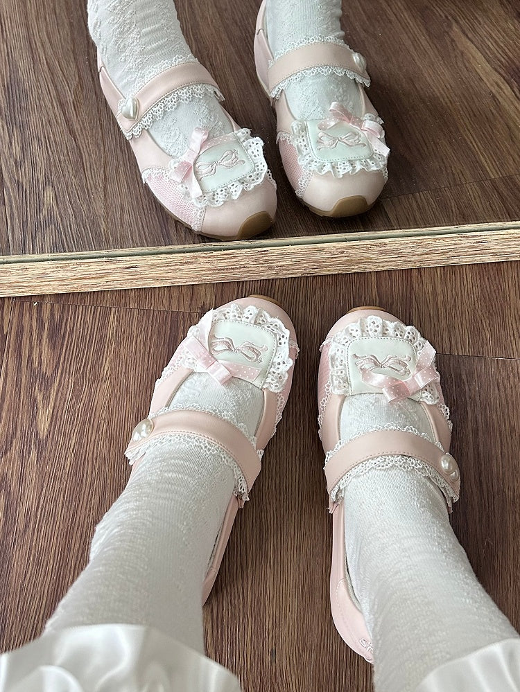 Heart-Embellished Lace Trim Velcro Closure Pink Flats in Sweet Lolita