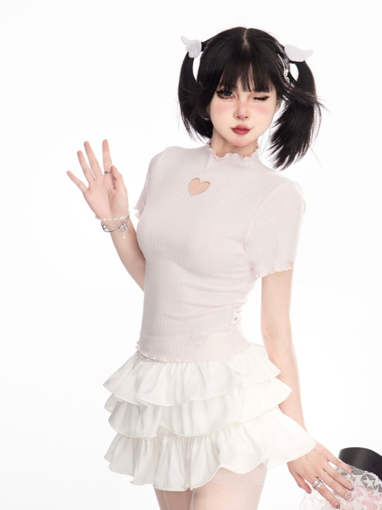 ハート型カットアウトレタス裾Tシャツネックピンクモック