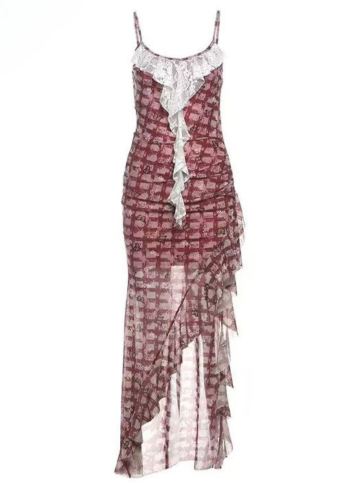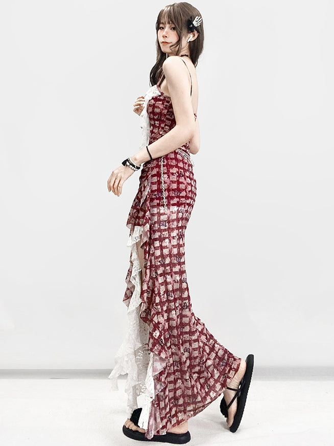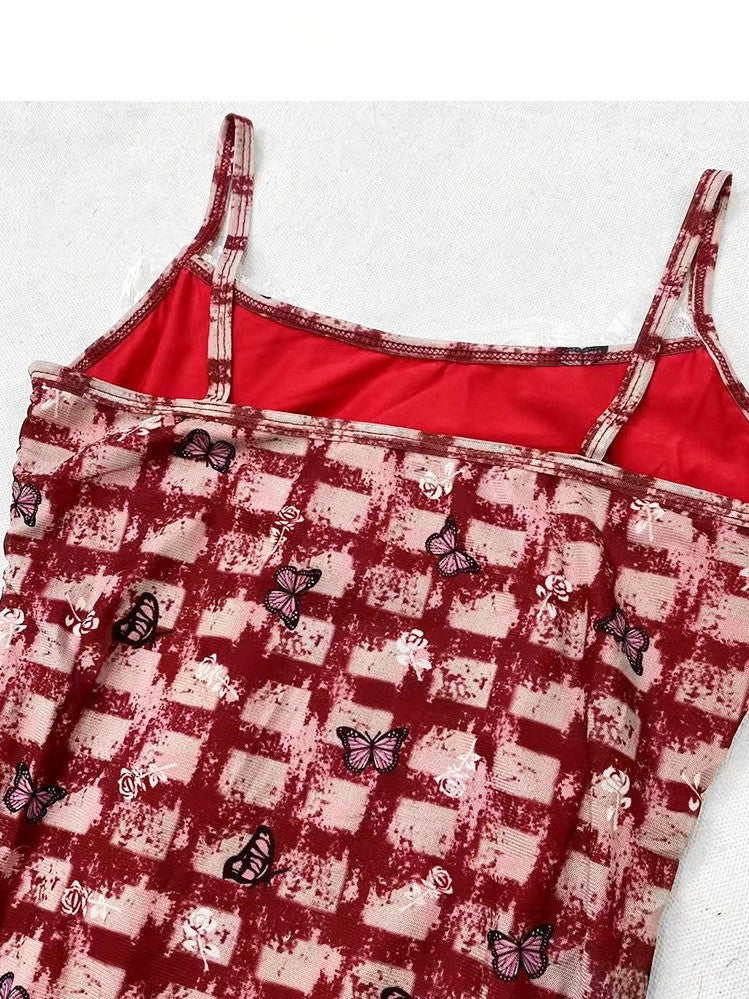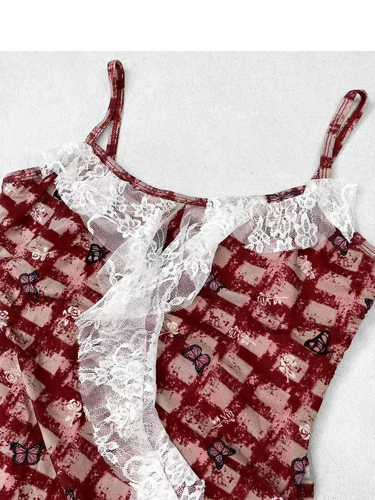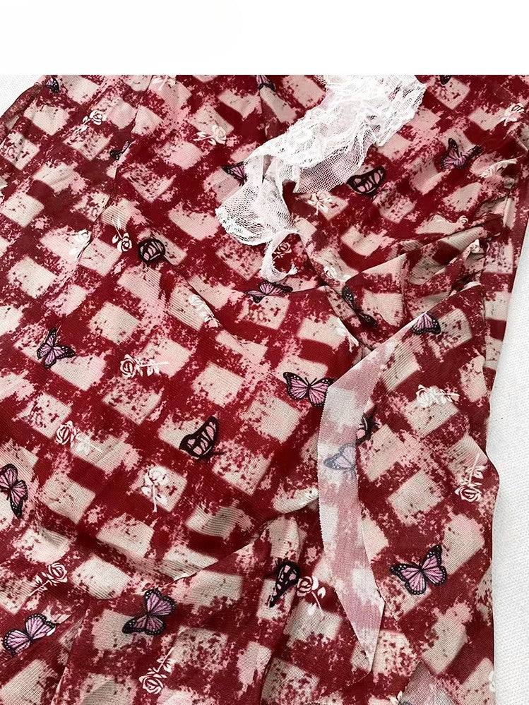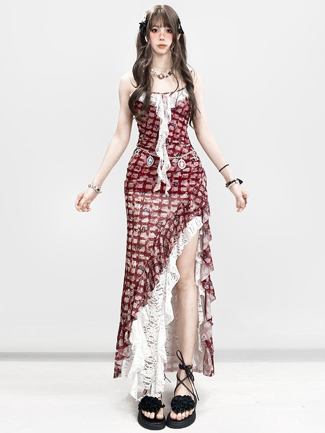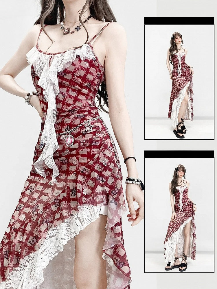 ほろ苦いグラマラスセット - 赤い蝶のチェック柄アシンメトリーヘムキャミワンピース + ホワイトレーススカート