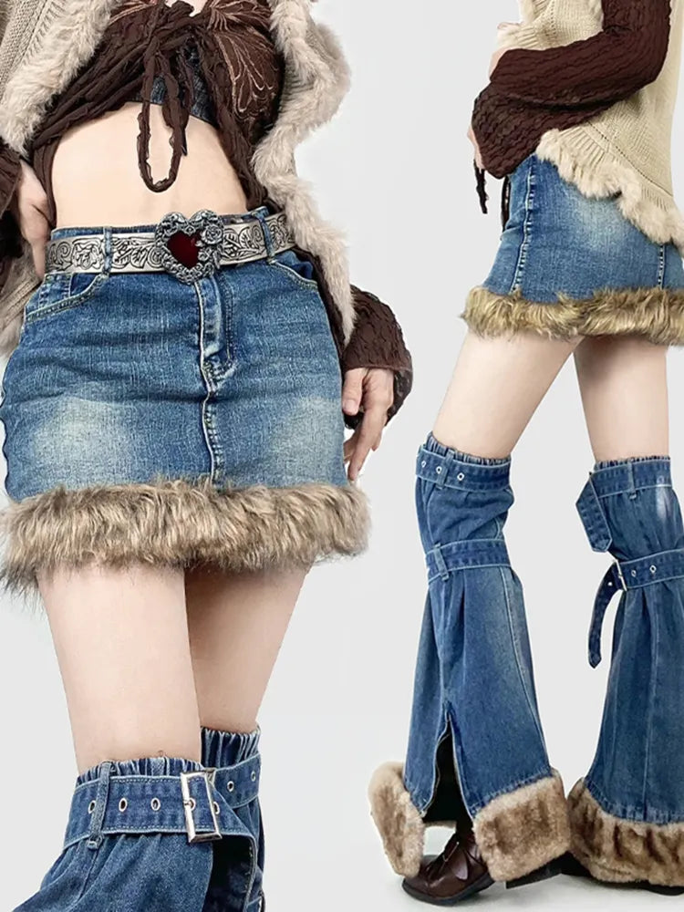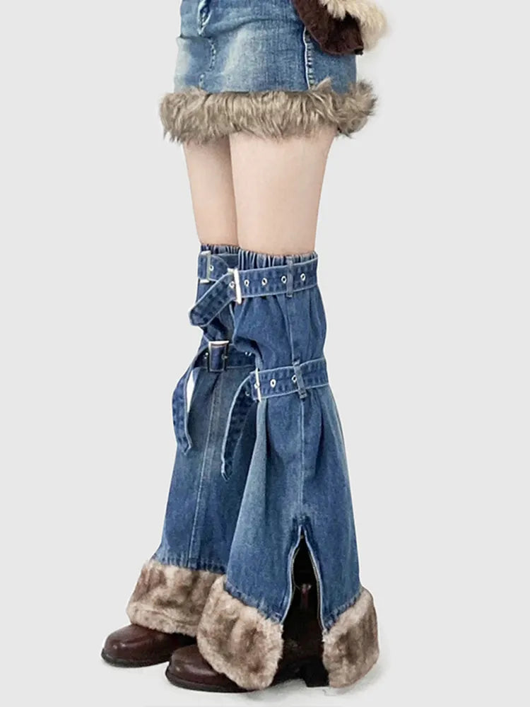ギャルファッション プラッシュヘム ブルーデニムスカート + バックルストラップ サイドスリット レッグウォーマー