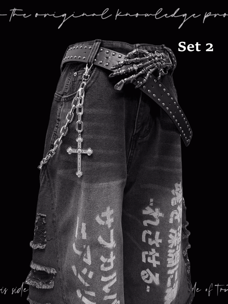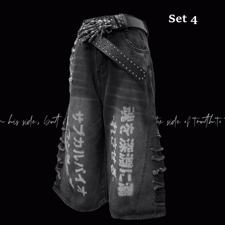 穴あき裾パンクフェードウォッシュダメージ加工ダークワイドレッグジーンズグレー