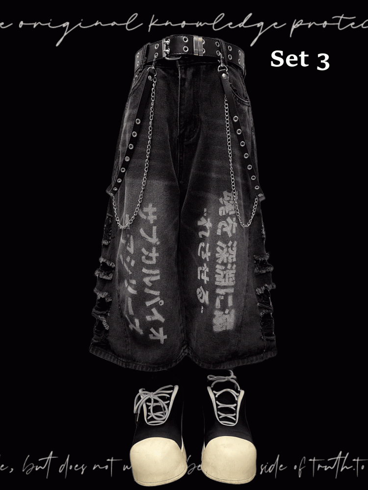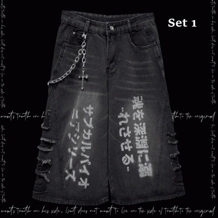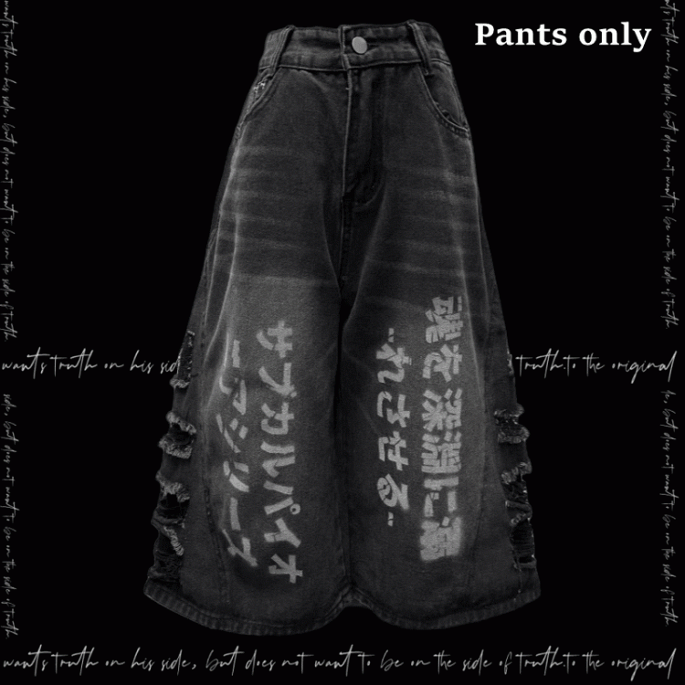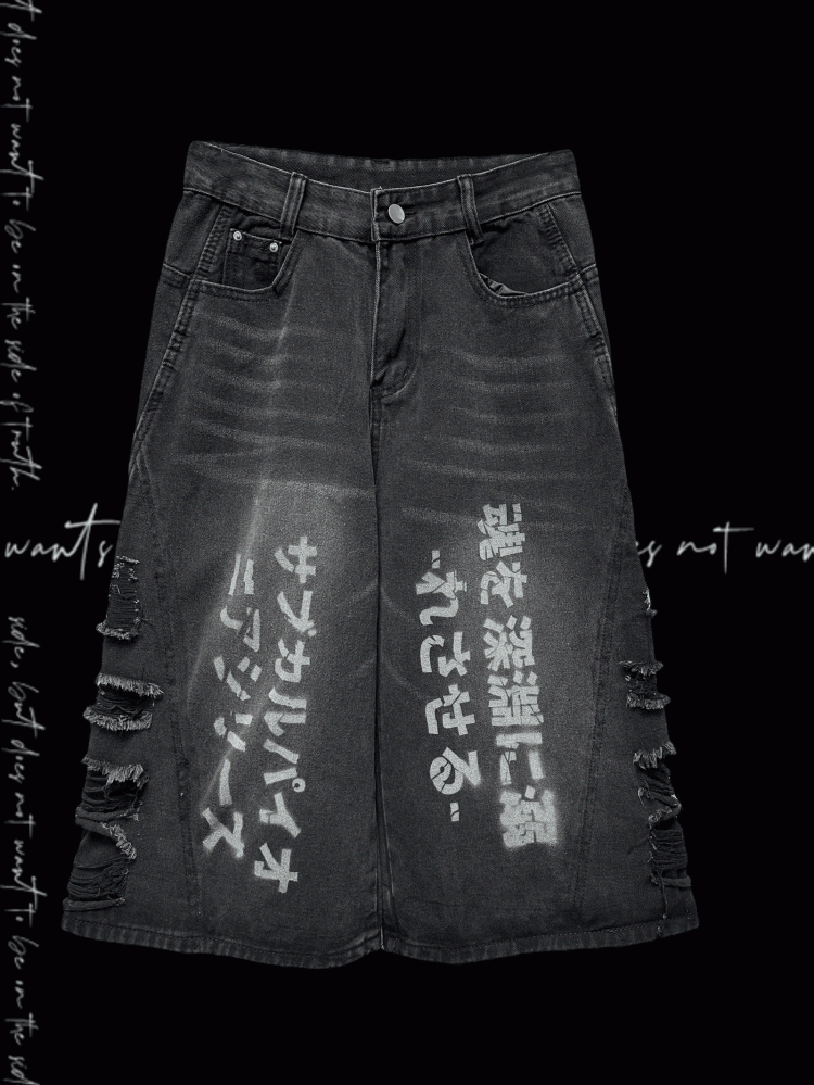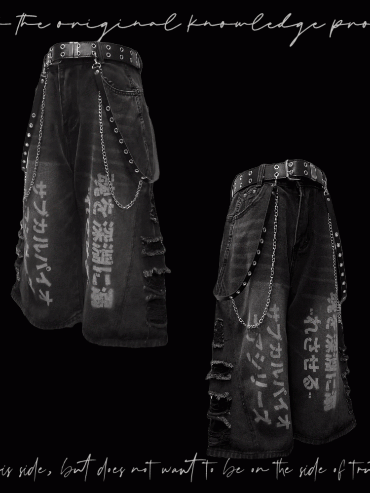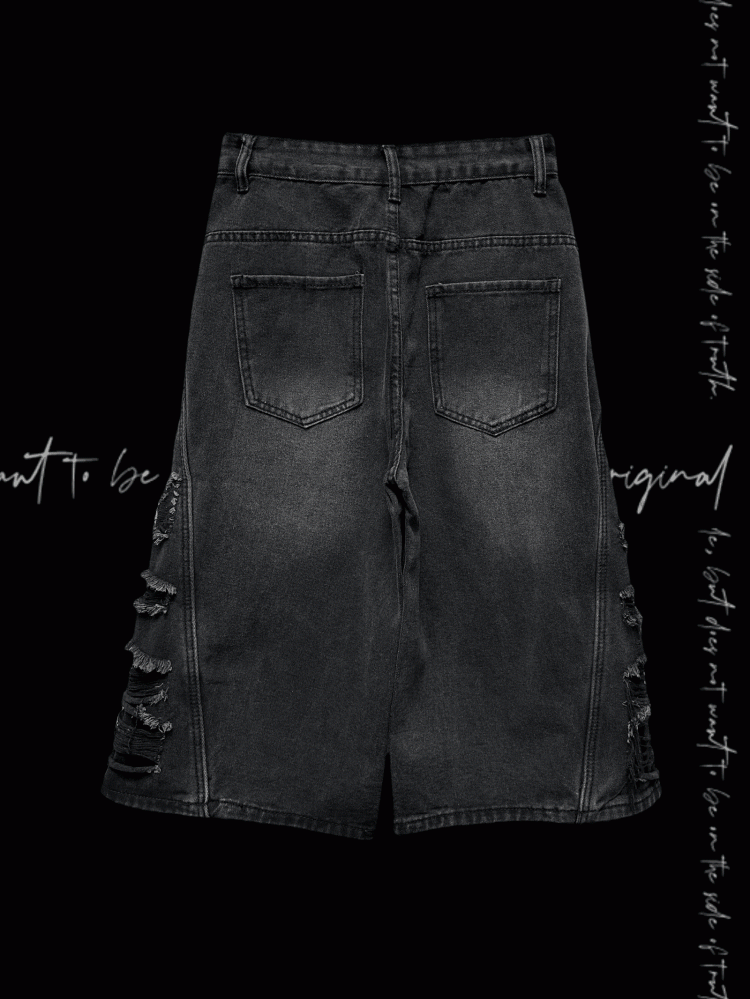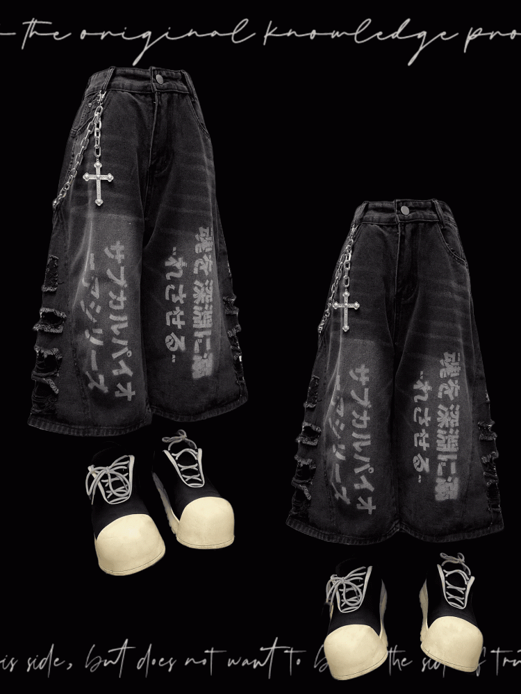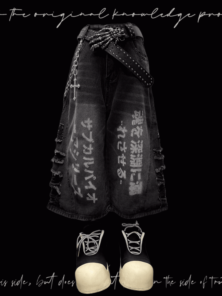 ダークグレーのフェードウォッシュ加工、ダメージ加工の穴あき、裾の切りっぱなし、パンク風のワイドレッグジーンズ