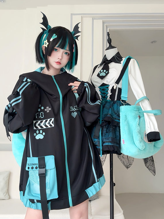 フード付きテックウェア ブラックフューチャリスティックジャケット ブルー&サイバーパンク