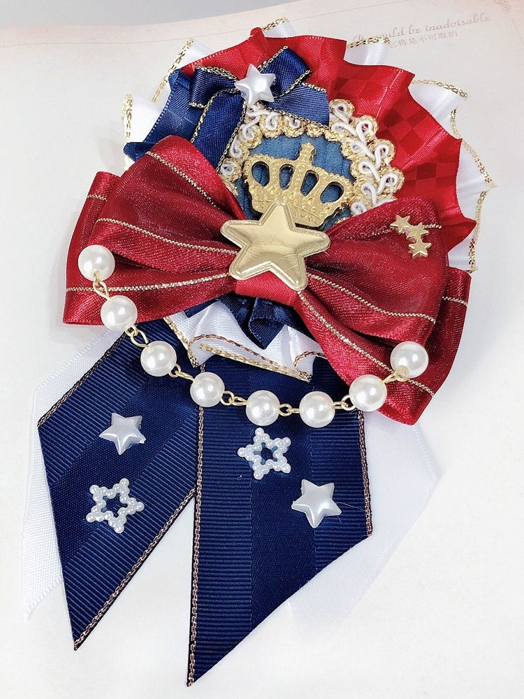 ブルー&レッドアイドルロリータクラウン装飾スターデザインビーズチャーム蝶結びディテールヘアクリップ