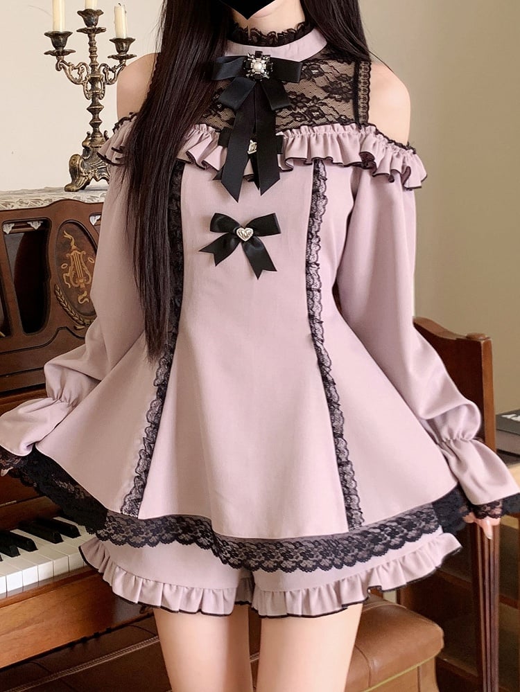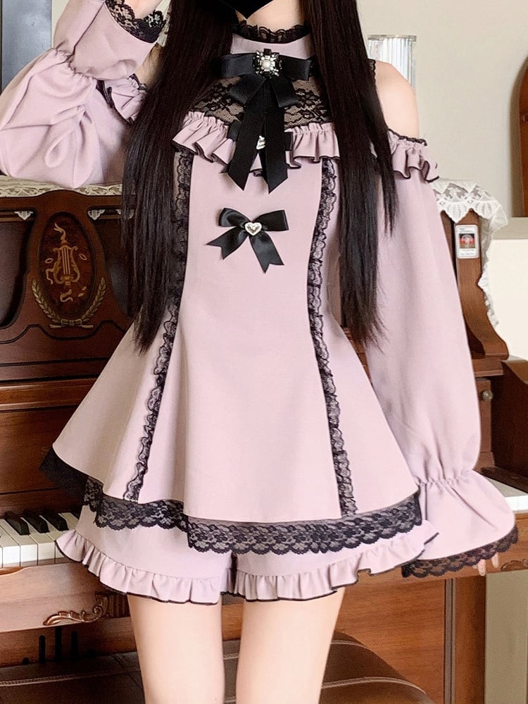 ● 蝶結びのディテール / コントラストのレースパッチ / カットアウトショルダー / レーストリム / ラッフルトリム