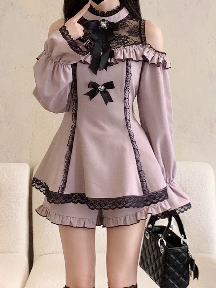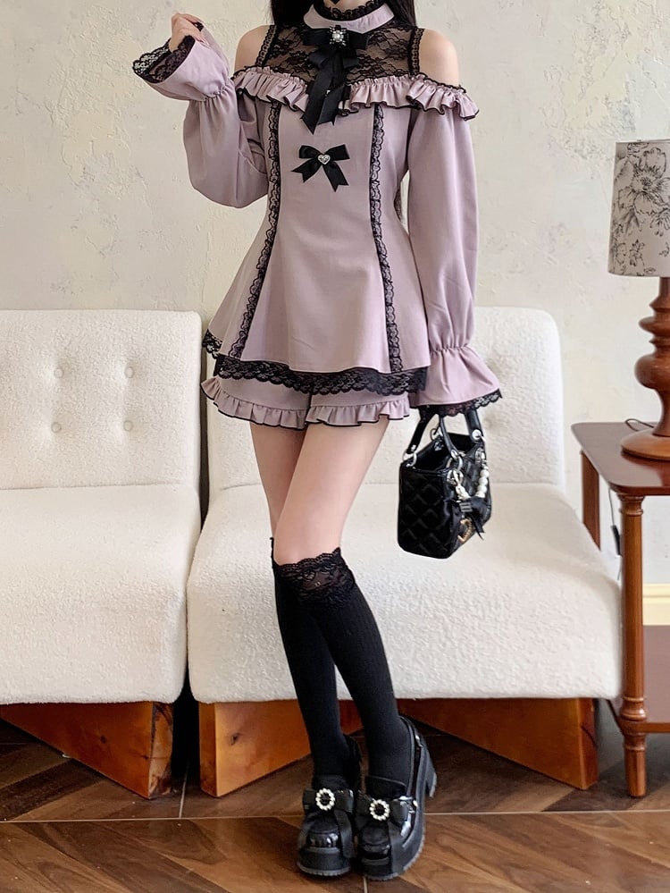 ジライケイ ブラック イリュージョンネックライン カットアウトショルダー パープル ミニスカート ドレス フリルヘム ショーツセット