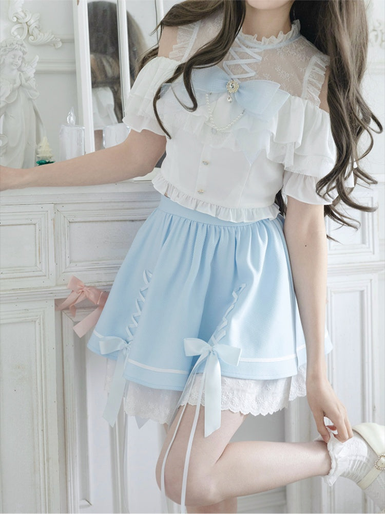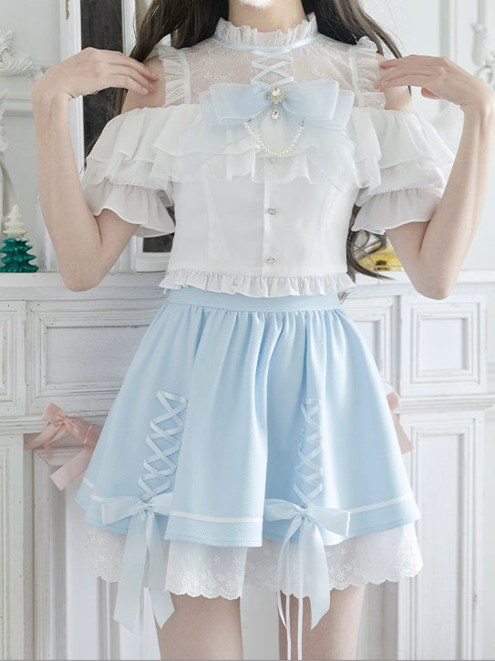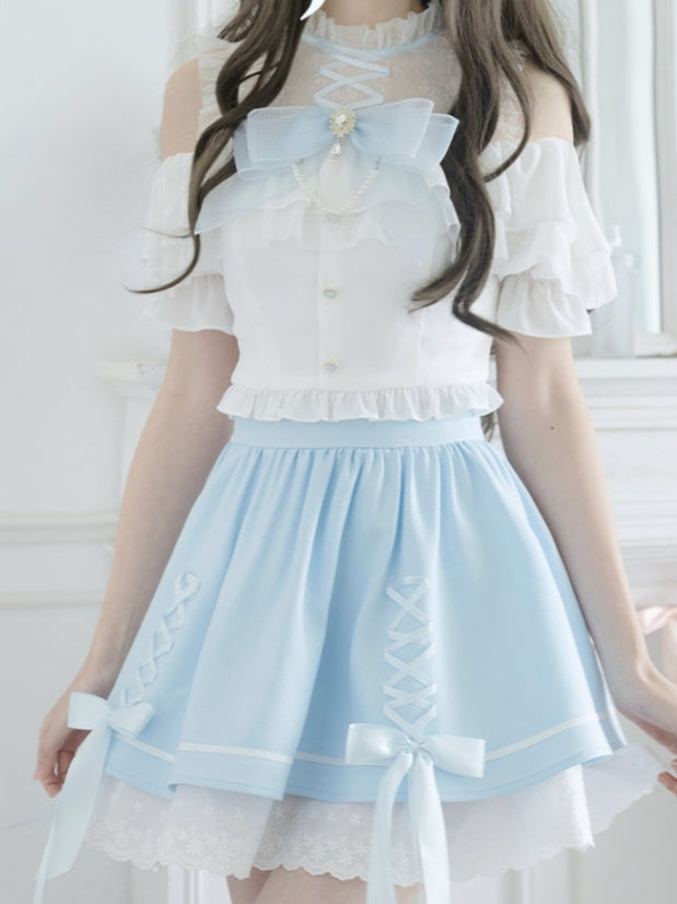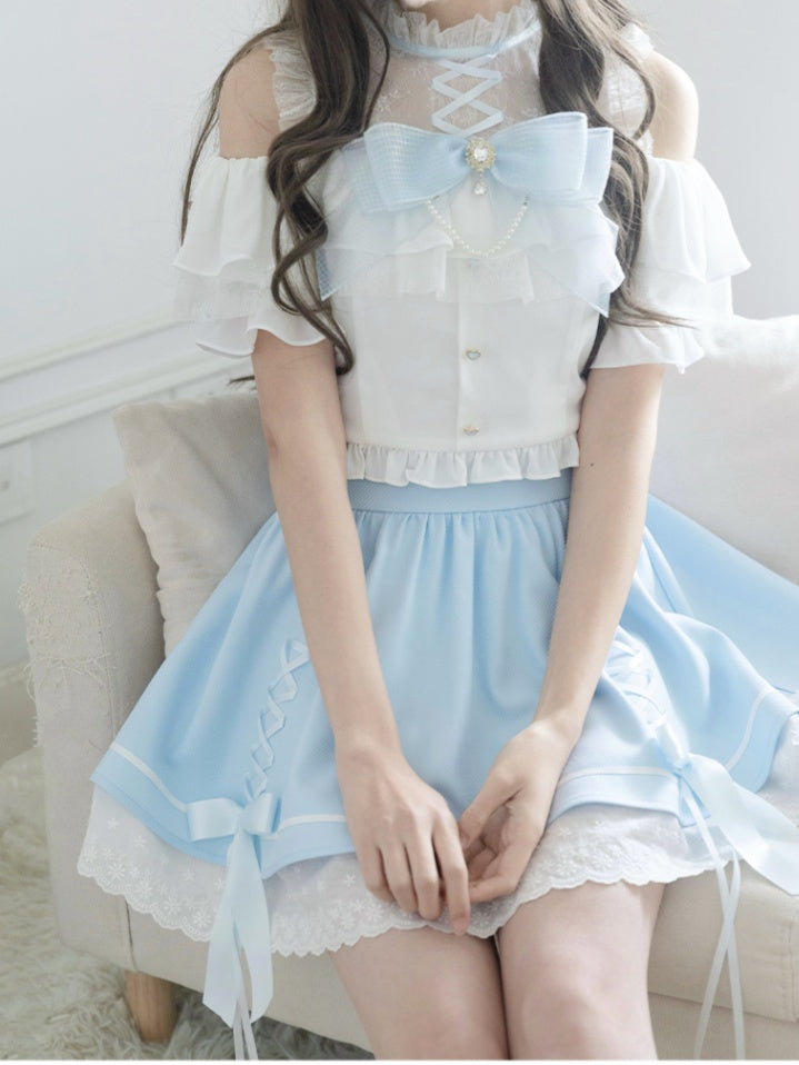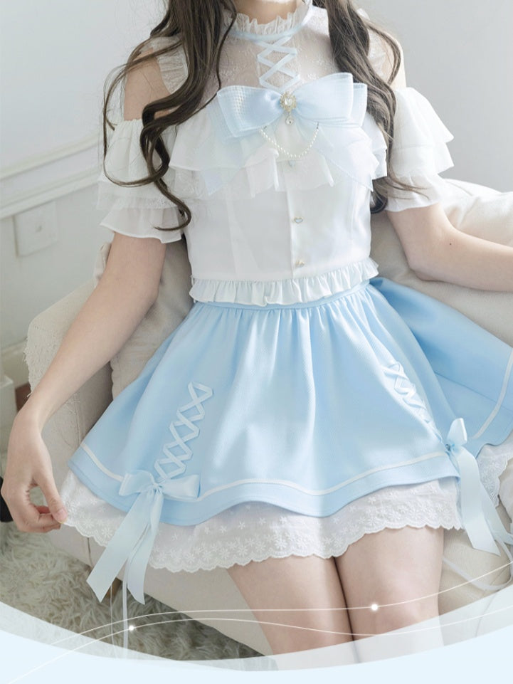イリュージョンスカートショルダーブルークロスオープンホワイトデザイントップ+ネックラインケイセットジライ