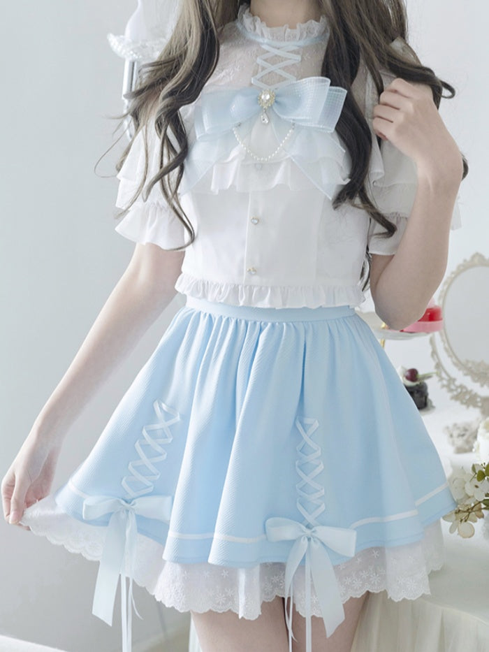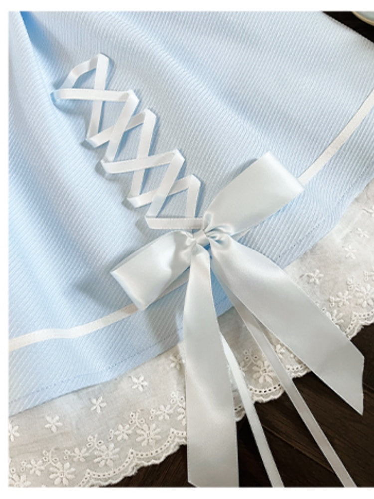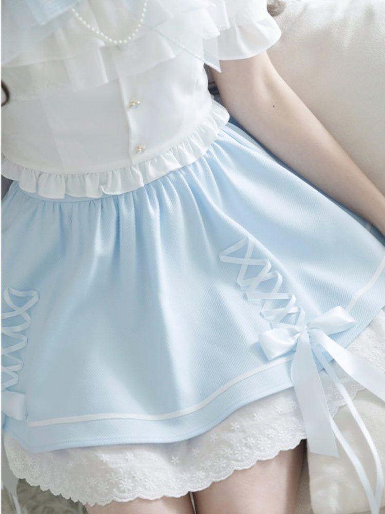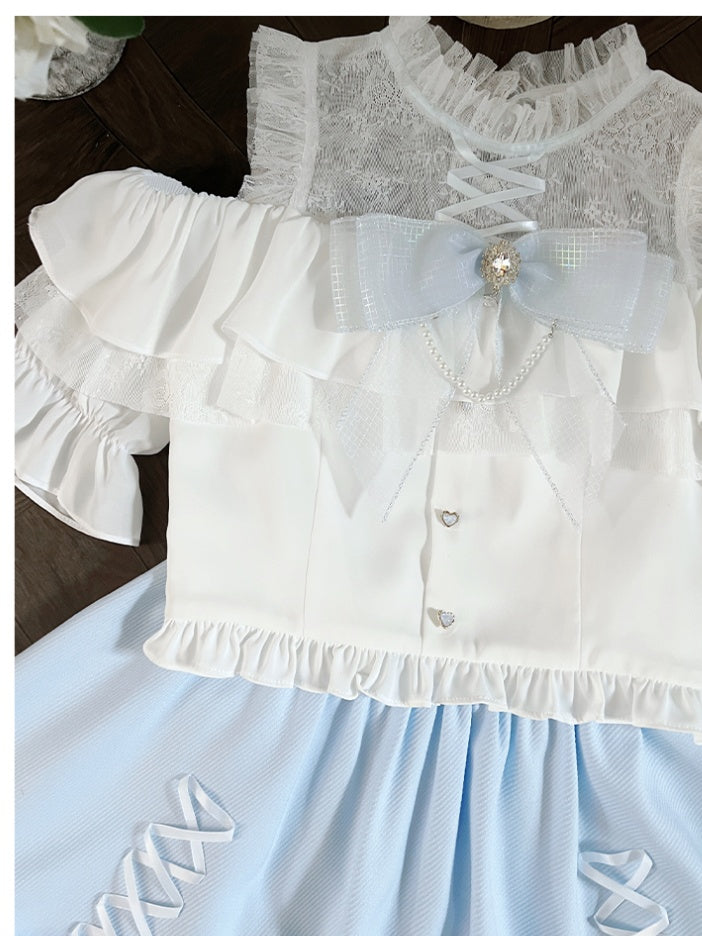青と白のオールドスクールロリータファッションドレス 蝶結びディテール JSK セット