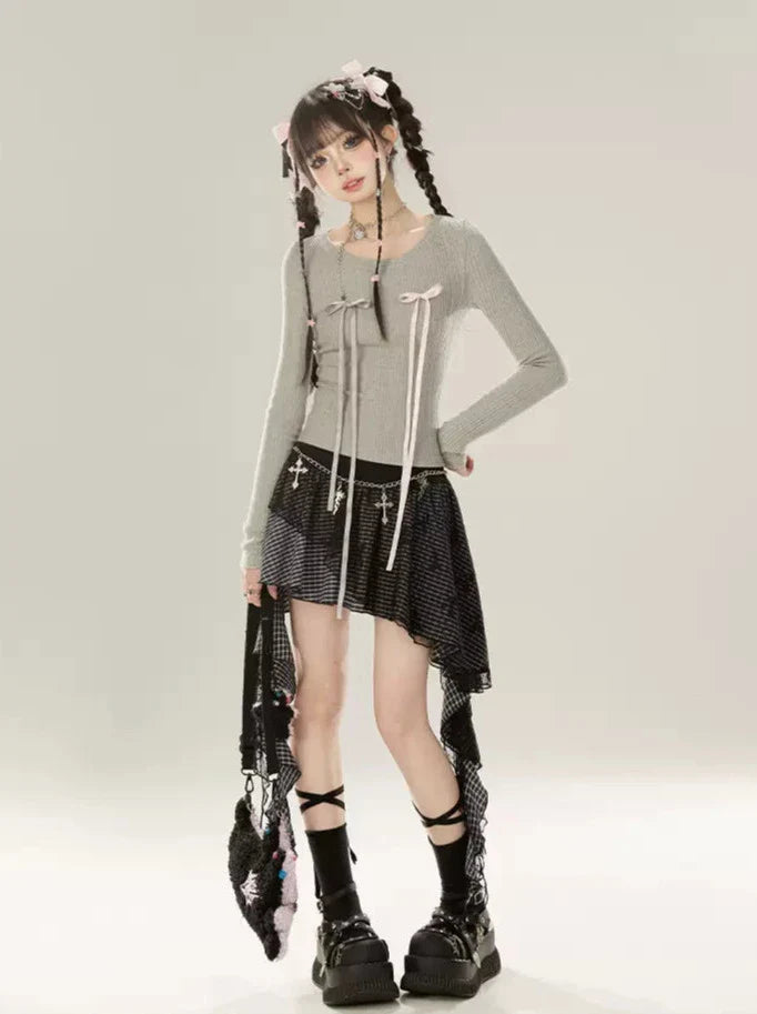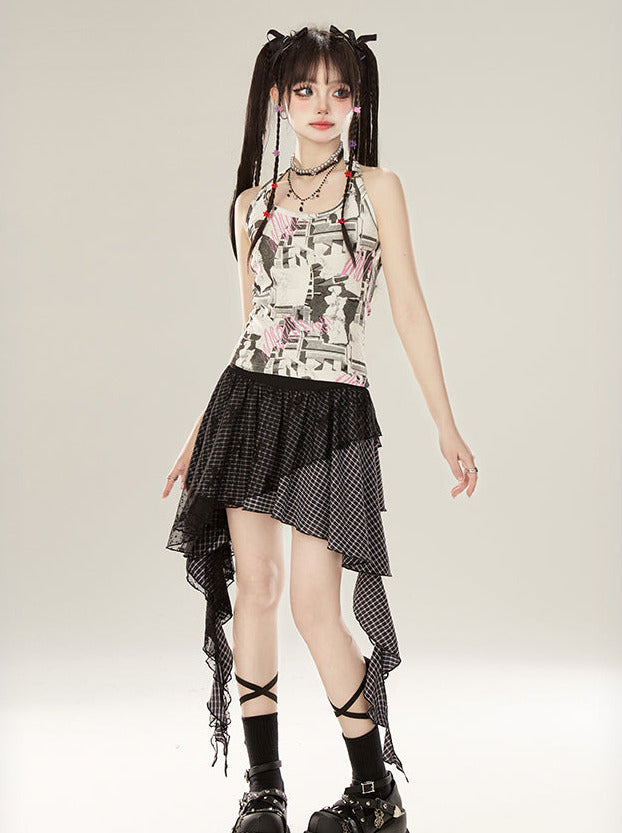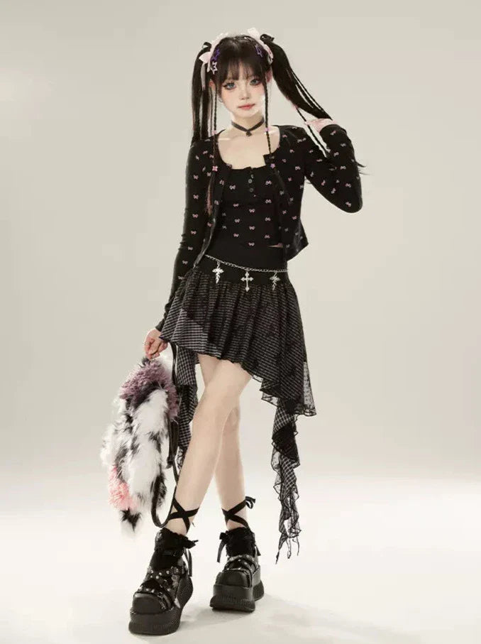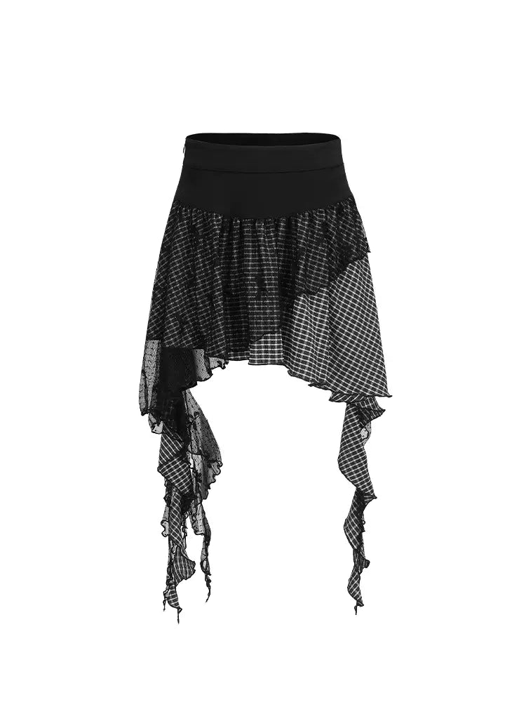 ユニークなチェック柄と繊細なフリルのディテールが特徴のレーススカートは、どんな装いにも華やかさを添えてくれます。軽やかなメッシュ素材で仕立てられており、どんなシーンにも合わせやすい、可愛らしく快適な一枚です。