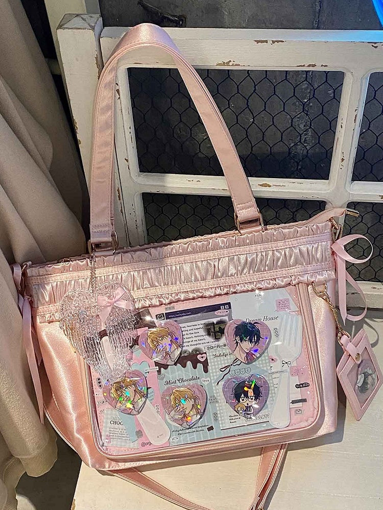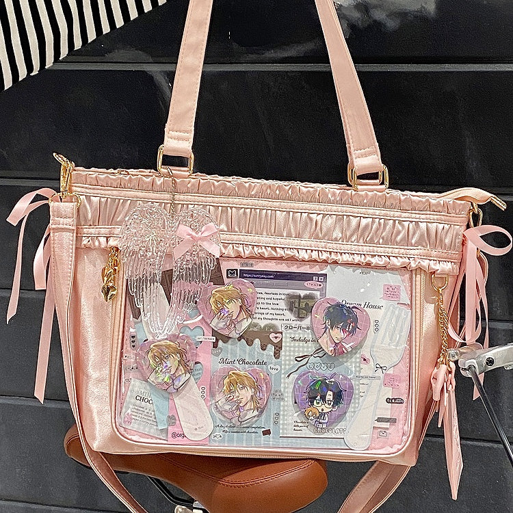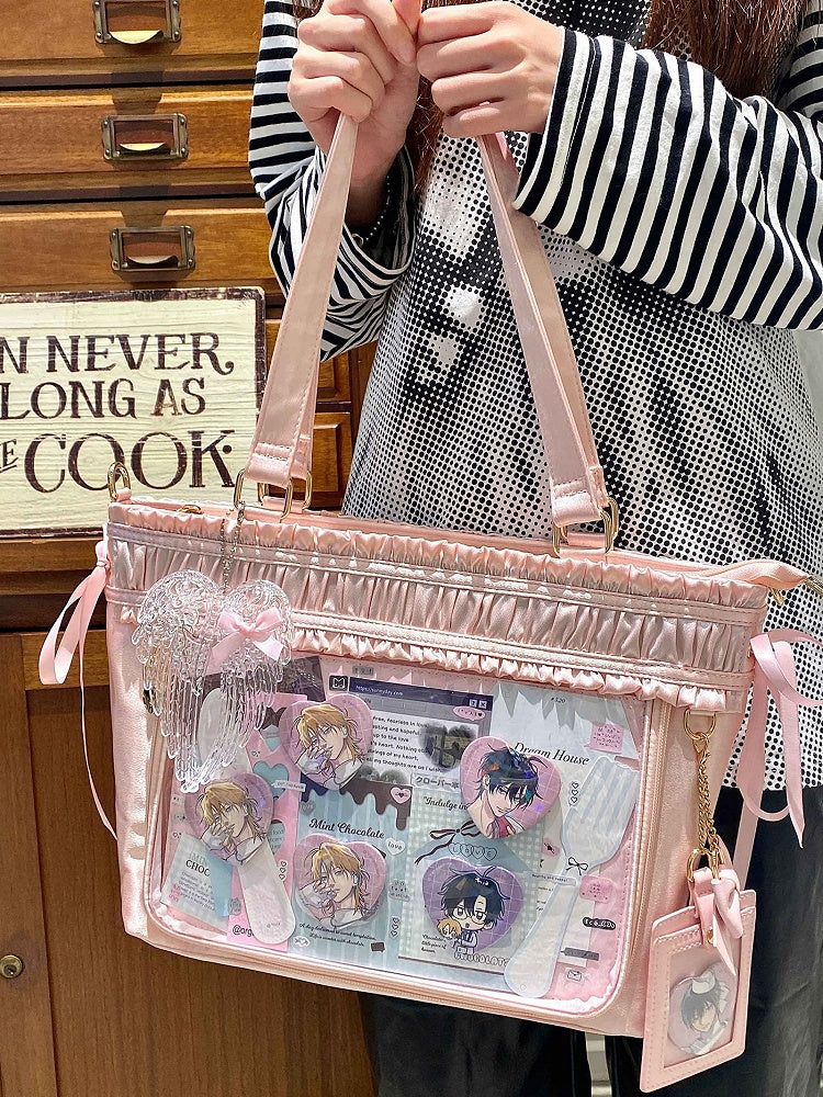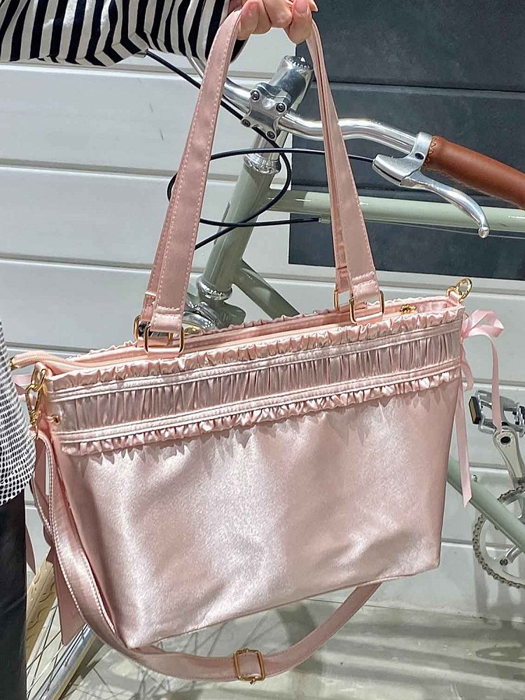 ピンクのフリルトリムリボンボウ大容量トート痛バッグ