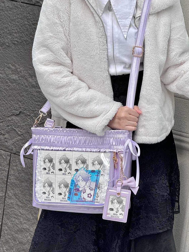 パープルのフリルトリムリボンボウ付き大容量トートバッグ