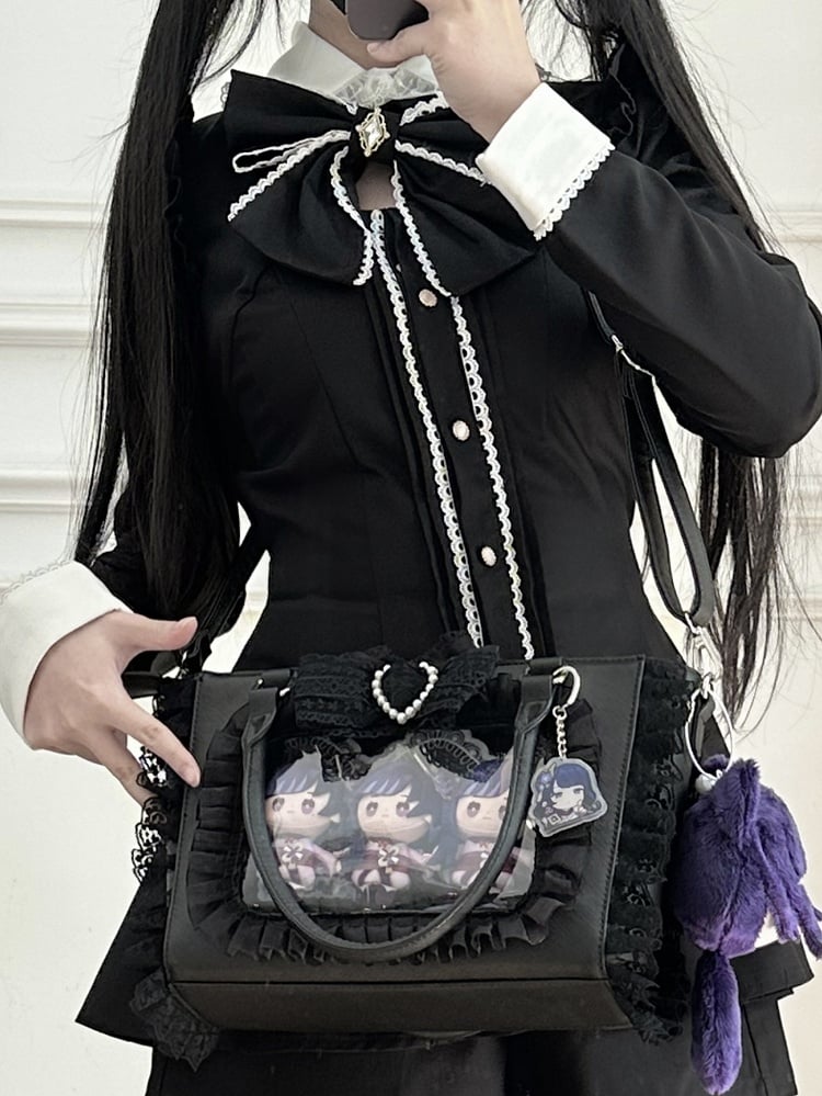 ジライケイ ブラックビーズハート装飾 蝶結び レーストリム イタバッグ PVCカードホルダー付き