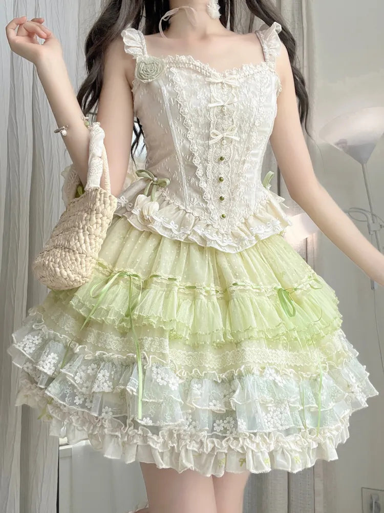● ビーズディテール / サイドに隠しジッパー / バックにレースアップ開閉 / フリルトリム