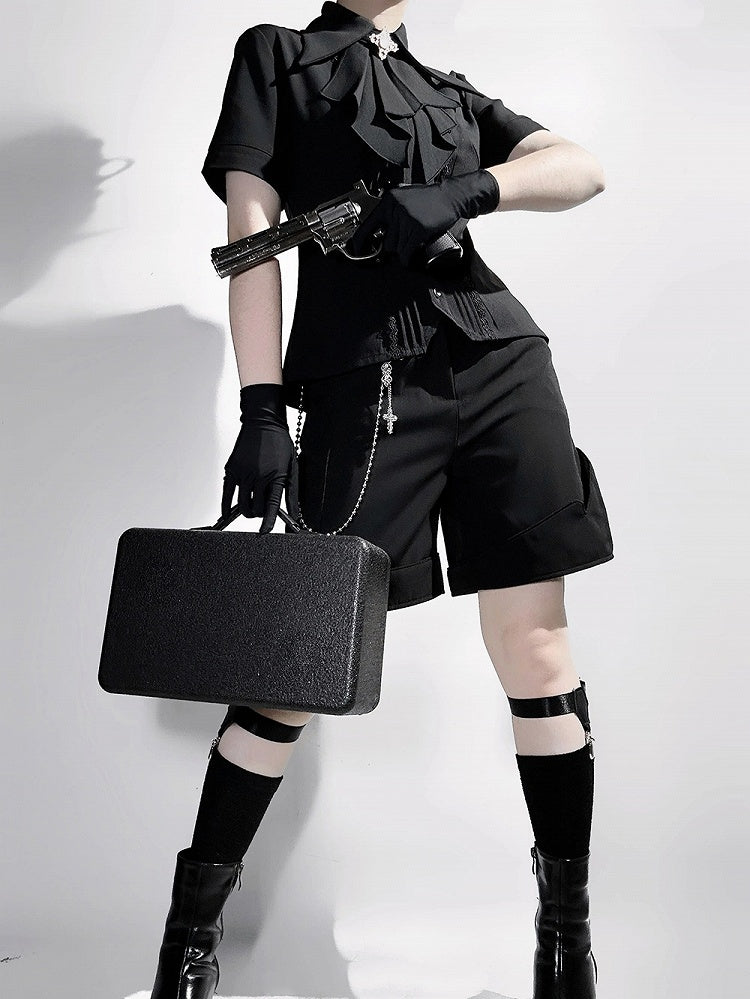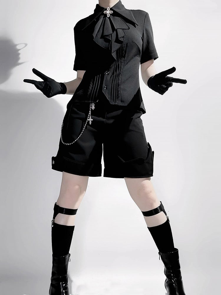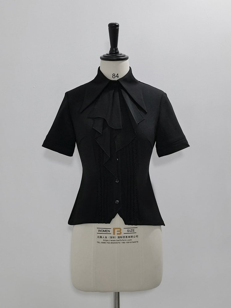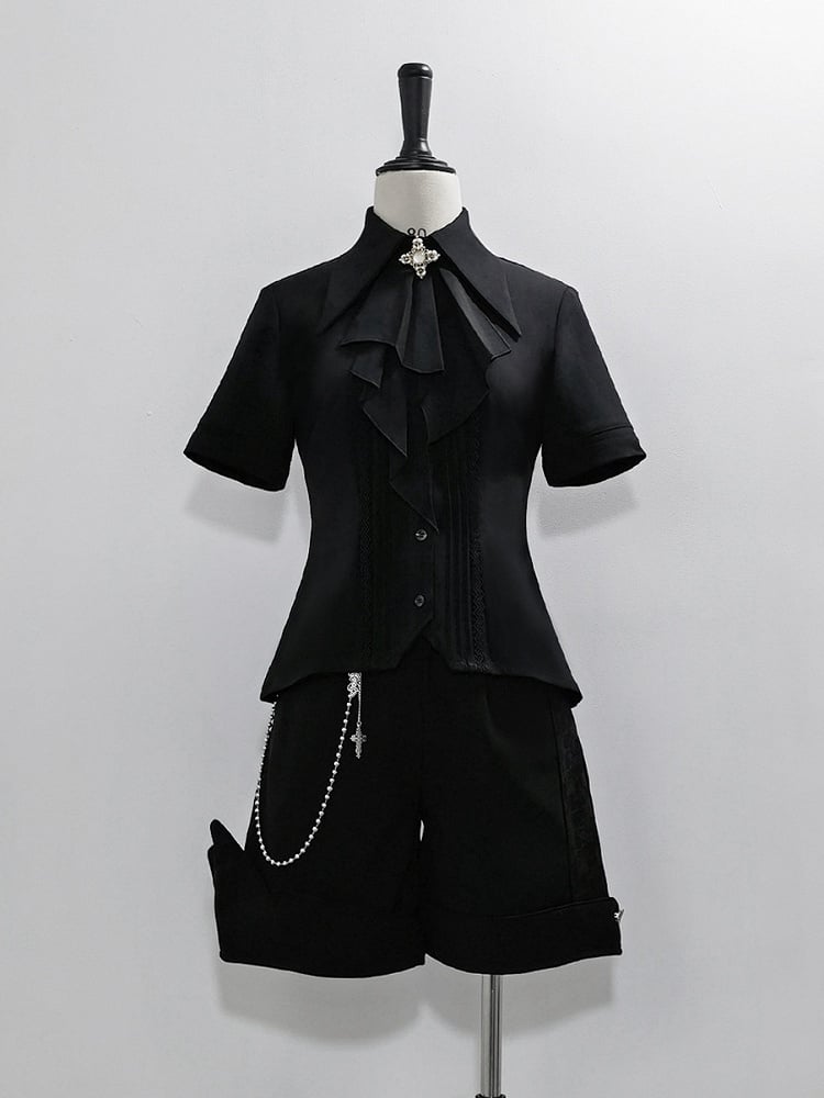 ブラック王子ファッション ロリータ ジャボ ポインテッド フォールドオーバーカラー 半袖シャツ