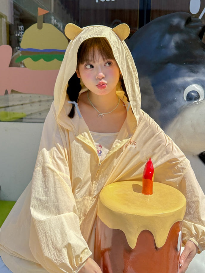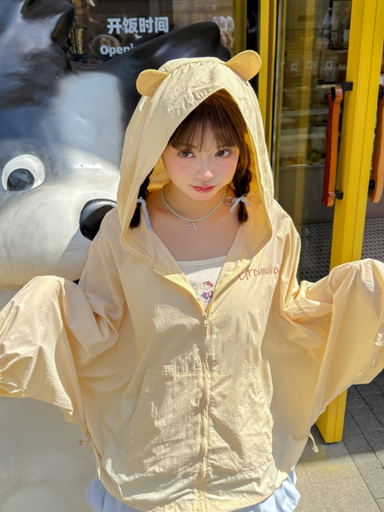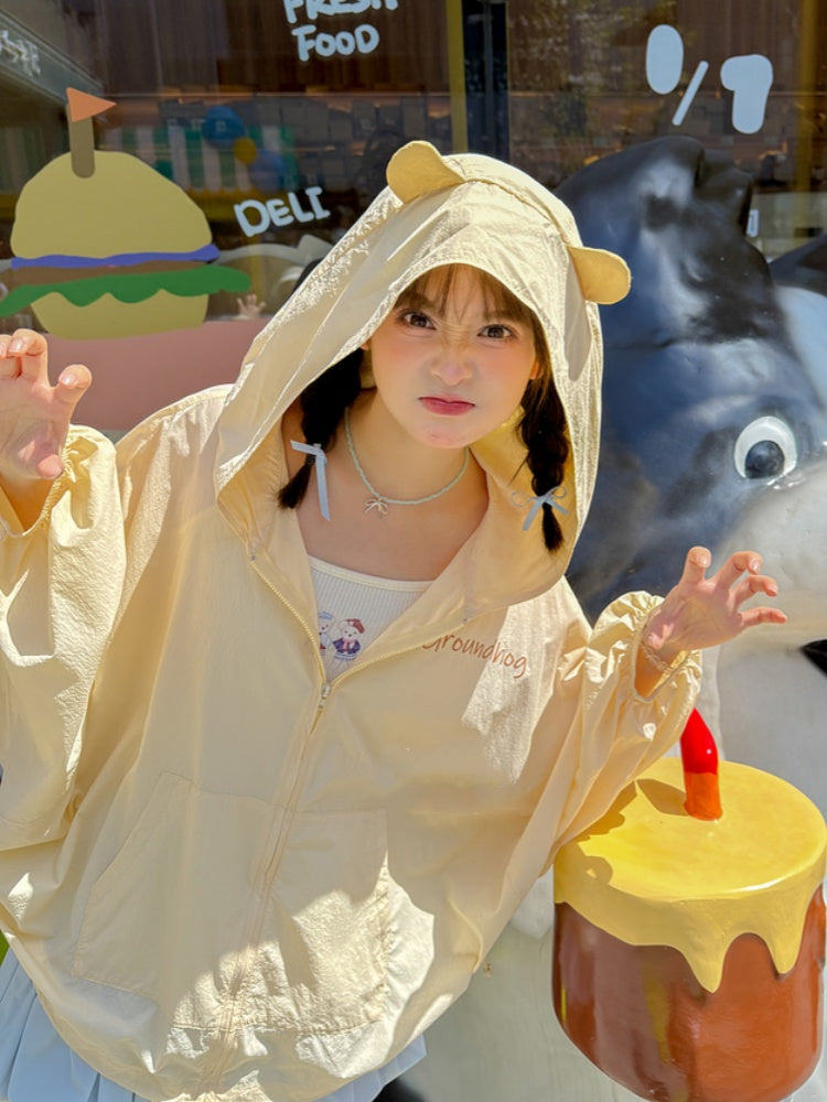ジャケット 日焼け防止 ドローストリング イエロー マーモットの耳デザイン フード裾