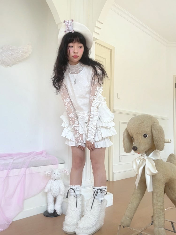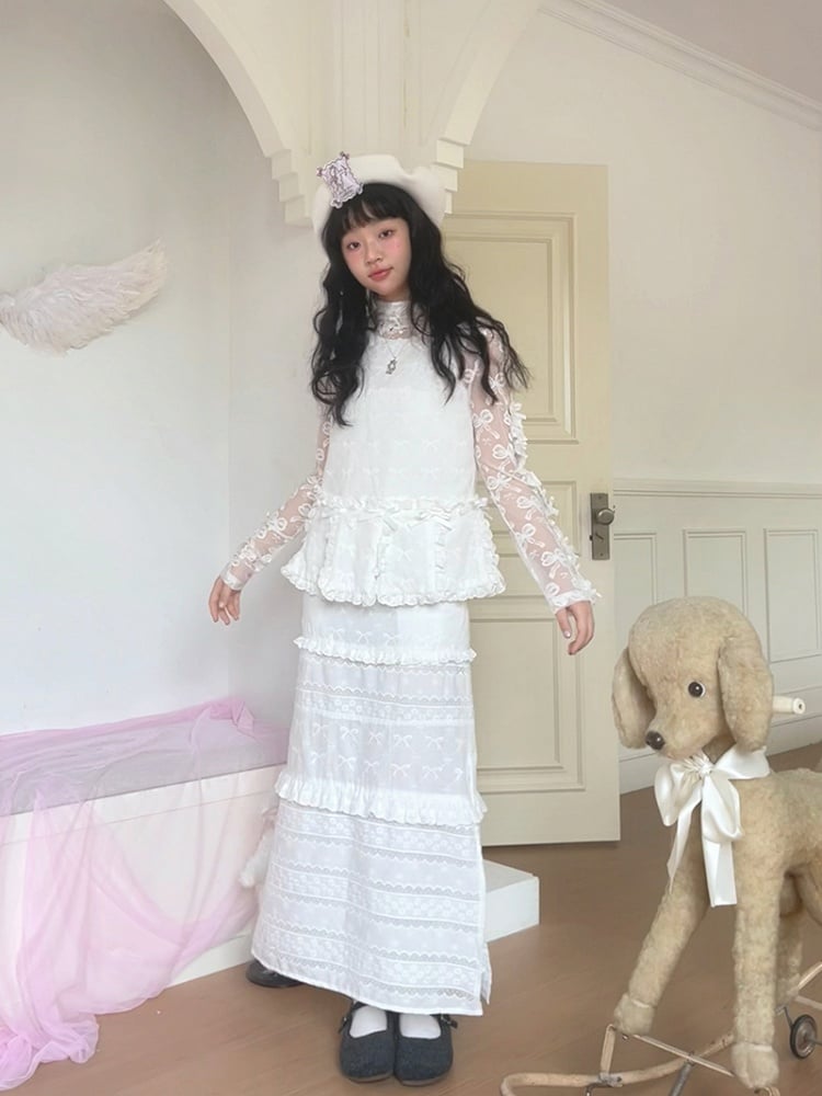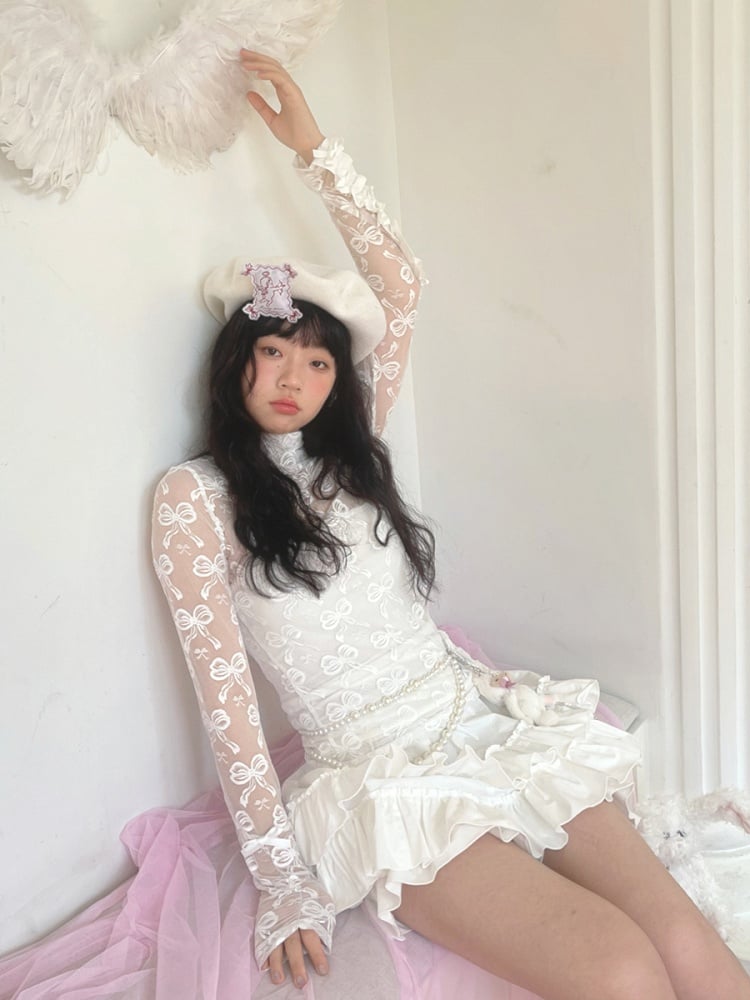 Jacquard Semi-Sheer White Bowknot Long Sleeve Top with Double Edge Ruffle