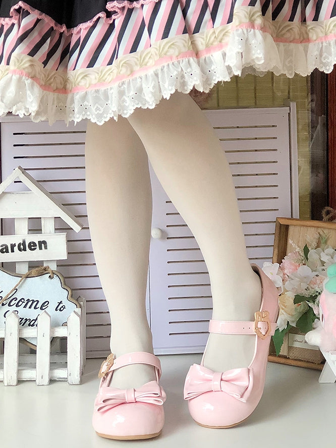 Low-heel PU Leather Pink Mary Janes - Round Toe Design, Bow at Top & Bunny Buckle