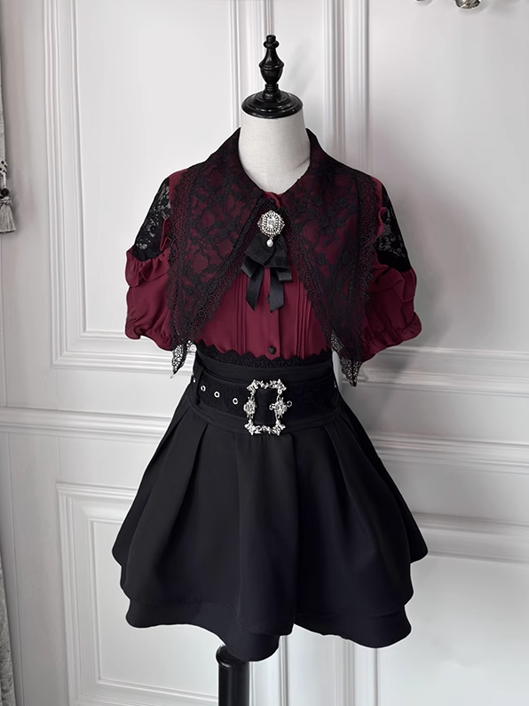 ジライカラーフラットレッドディテールブラウス+ティアードスカートセットポインテッドケイプリーツ