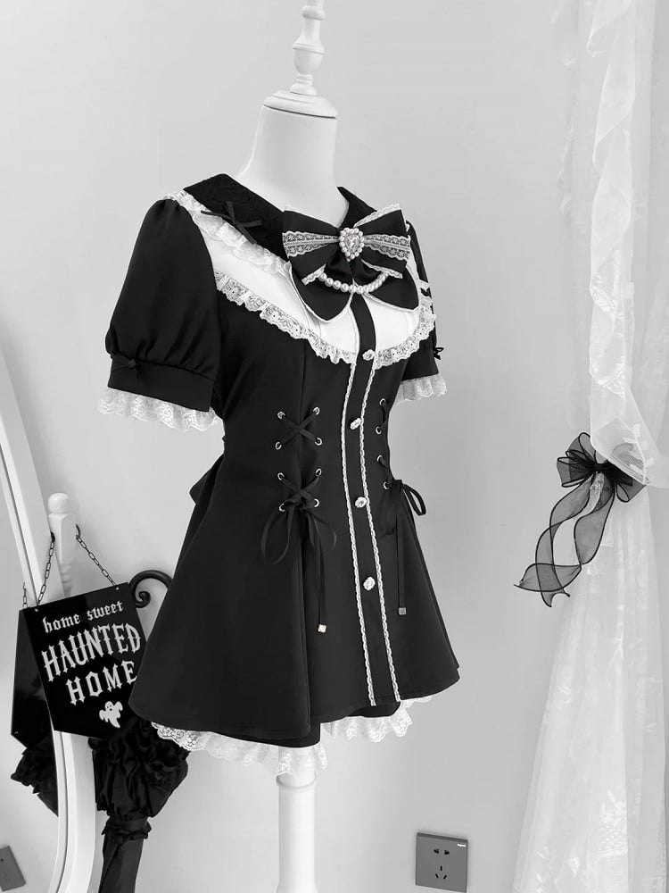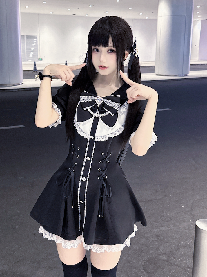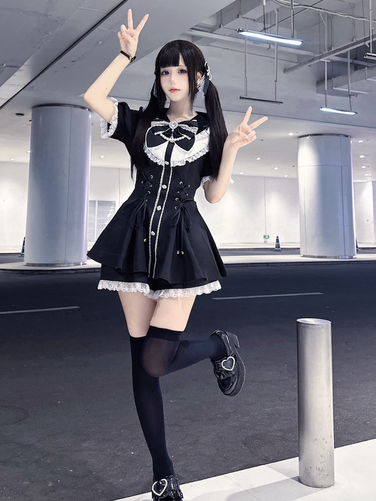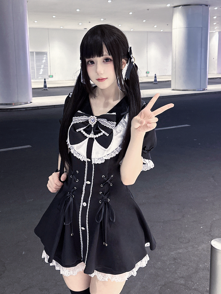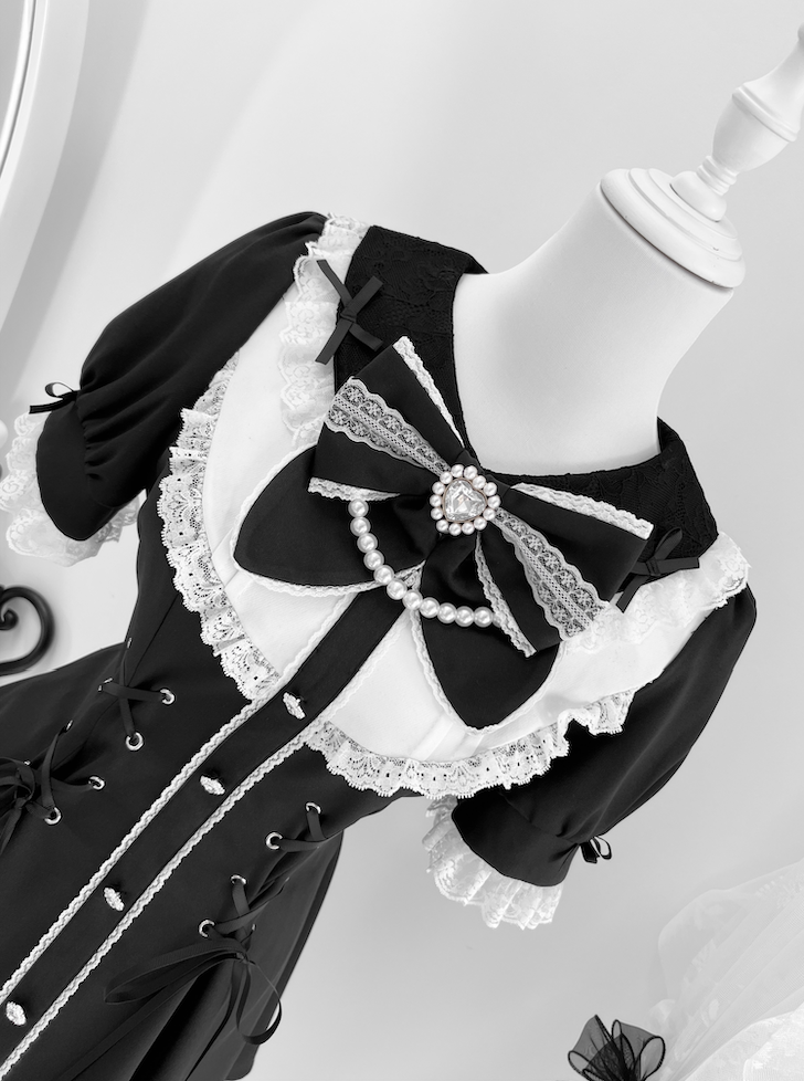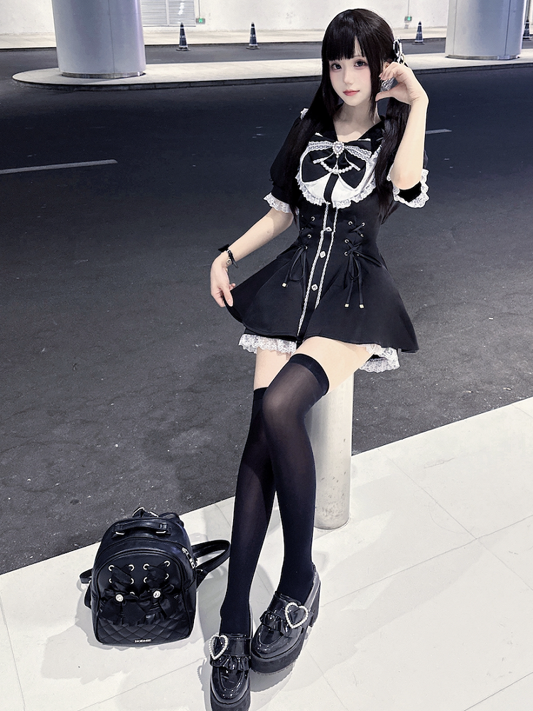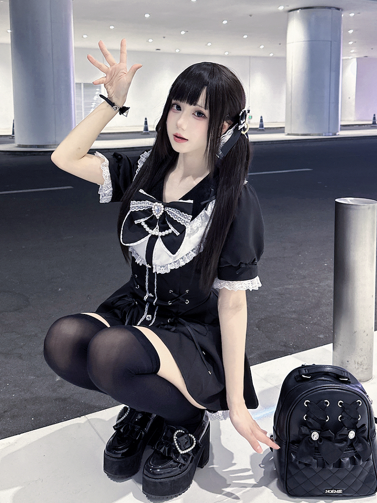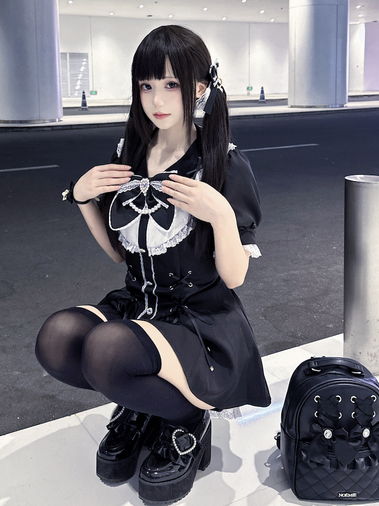 黒と白のオールドスクールロリータファッションドレス蝶結びロリータJSKセット
